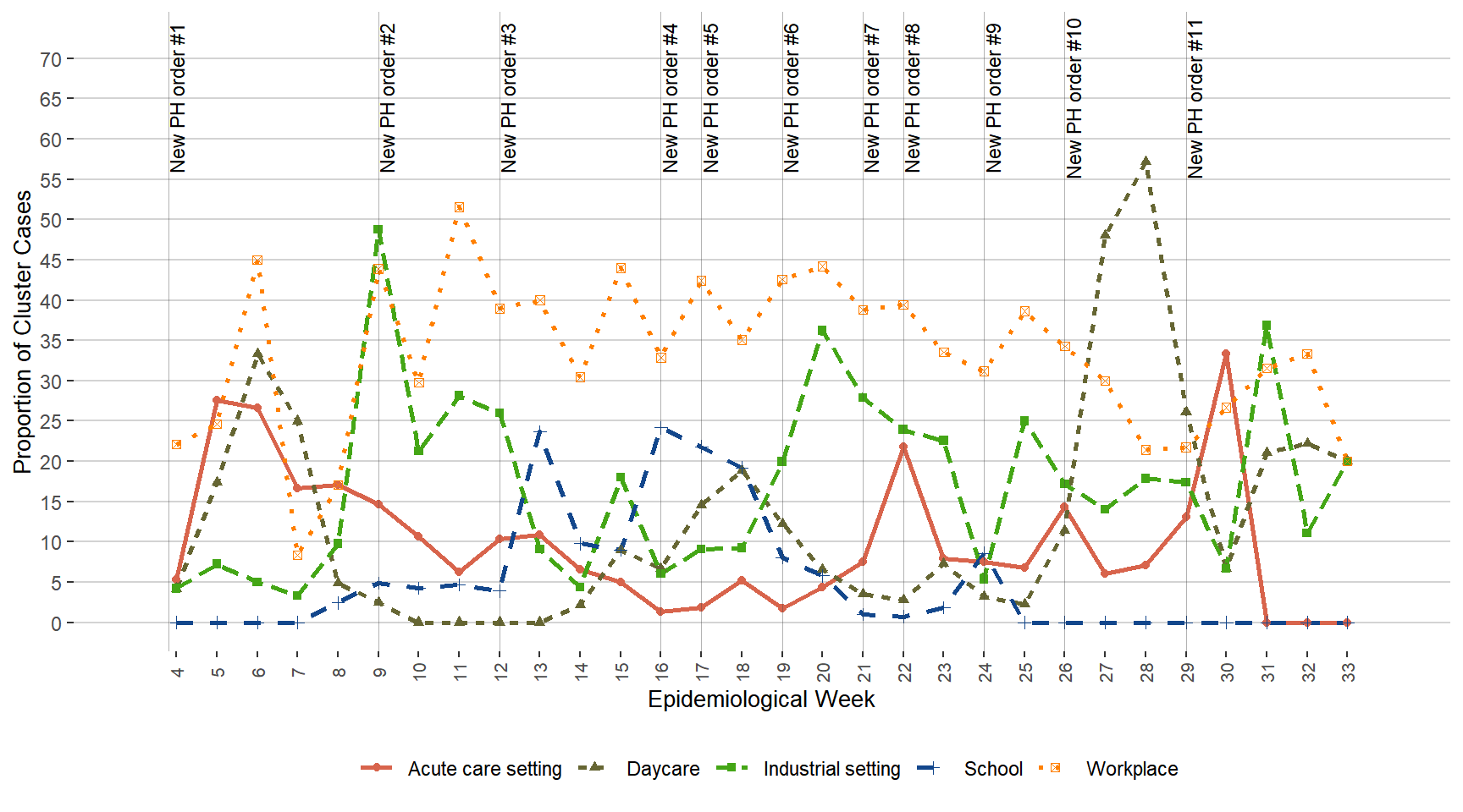 Figure 10. Percentage of COVID-19 Cases Linked to Top-five Cluster/Outbreak/Special Investigation Settings, Manitoba, January 24, 2021 – August 21, 2021
