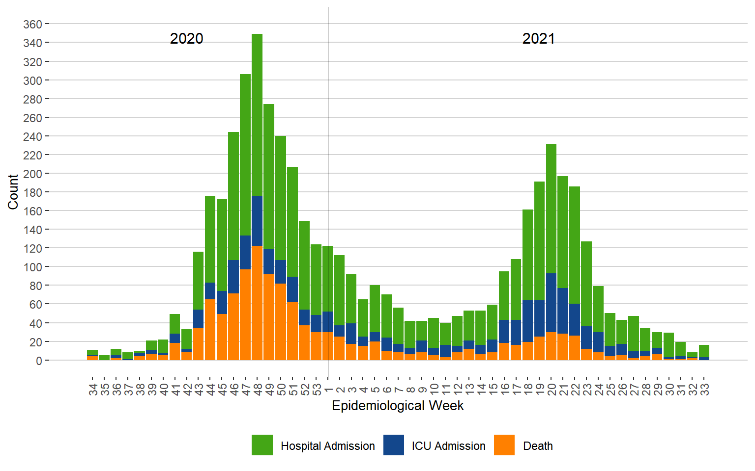 Figure 6. Severe Outcomes of COVID-19 by Week of Public Health Report Date, Manitoba, August 16, 2020 – August 21, 2021