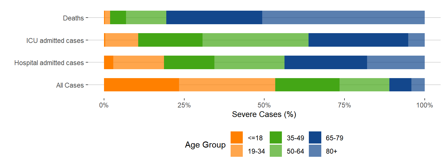 Figure 7. Age Distribution of Severe COVID-19 Cases Compared to All Cases, Manitoba, March 13, 2020 – August 21, 2021