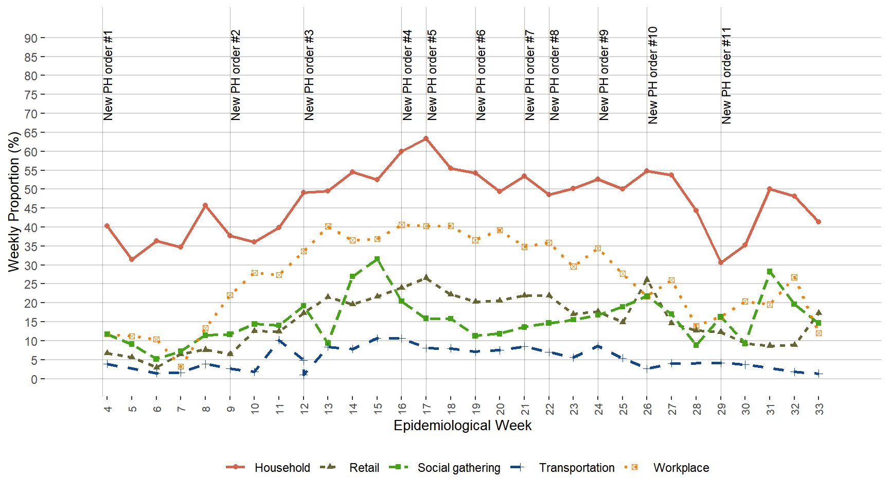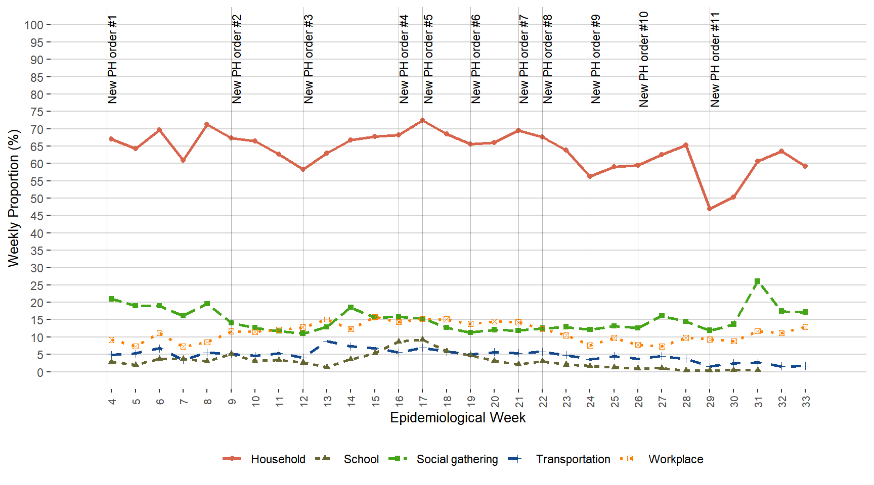 Figure 11. Percentage of Total COVID-19 Cases Exposed to Top-five Transmission Settings, Manitoba, January 24, 2021 – August 21, 2021