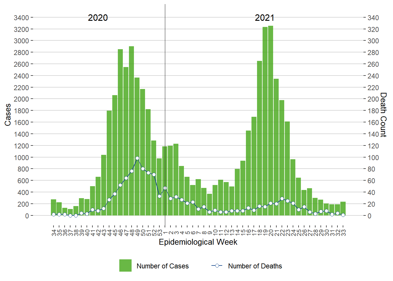 Figure 1. Cases of COVID-19 by Week of Public Health Report Date, Manitoba, August 16, 2020 – August 21, 2021
