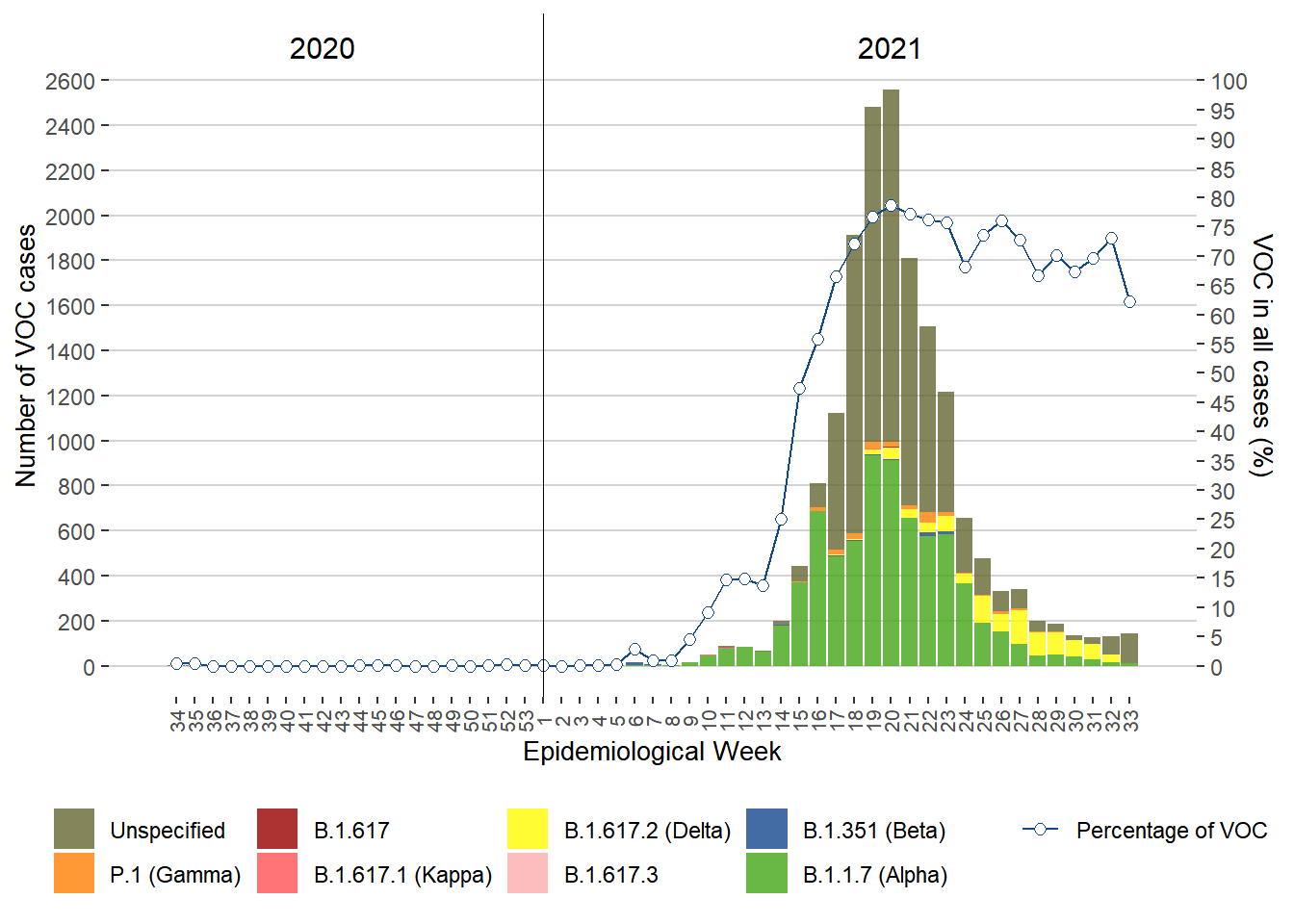 Figure 2. COVID-19 Cases of Variants of Concern (VOC) by Type and Percentage of VOC Cases in All Cases by Week of Public Health Report Date, Manitoba, August 16, 2020 – August 21, 2021
