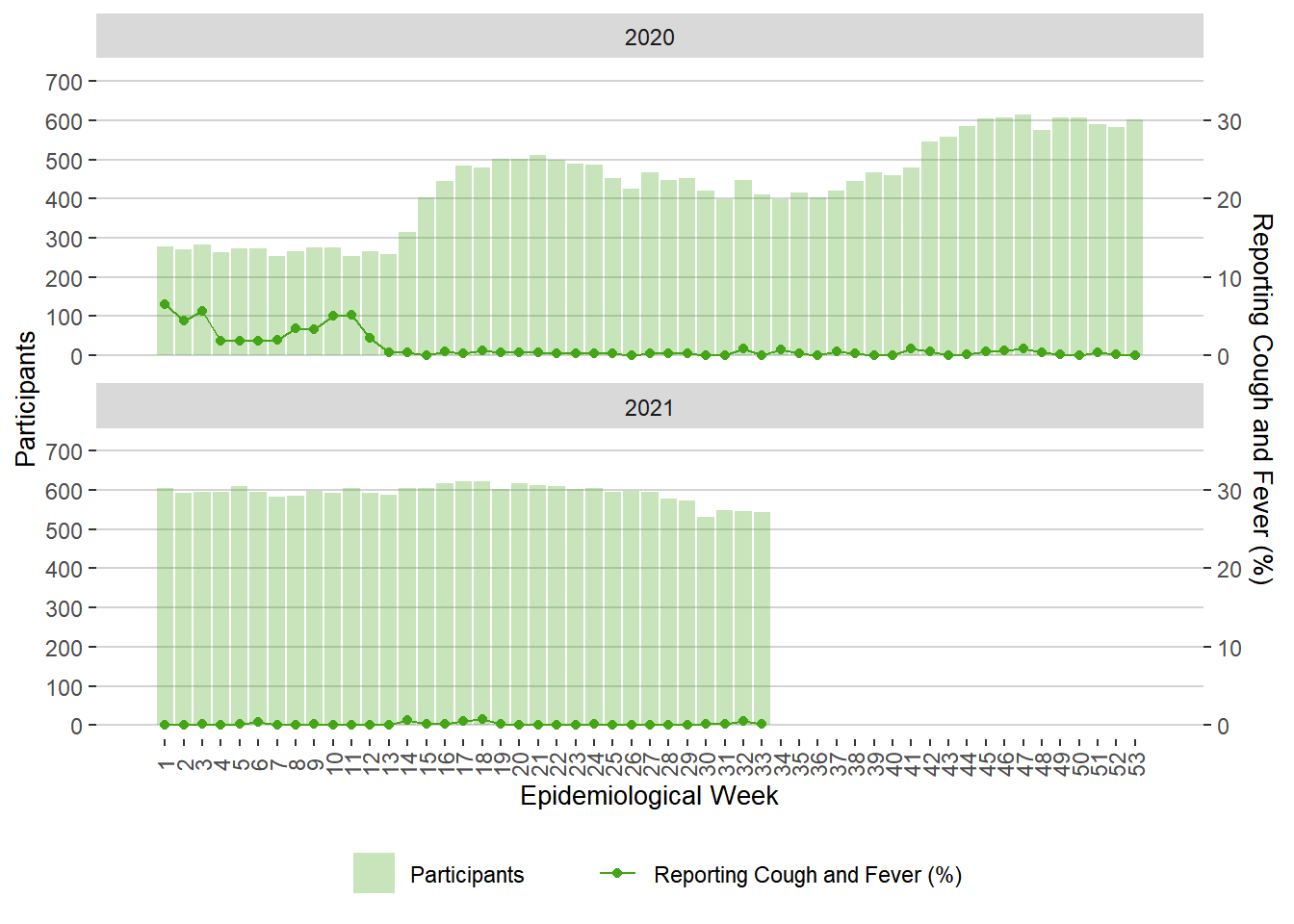 Figure 14. Weekly FluWatchers Participants and Percentage Reporting Fever and Cough, Manitoba, 2020 – 2021