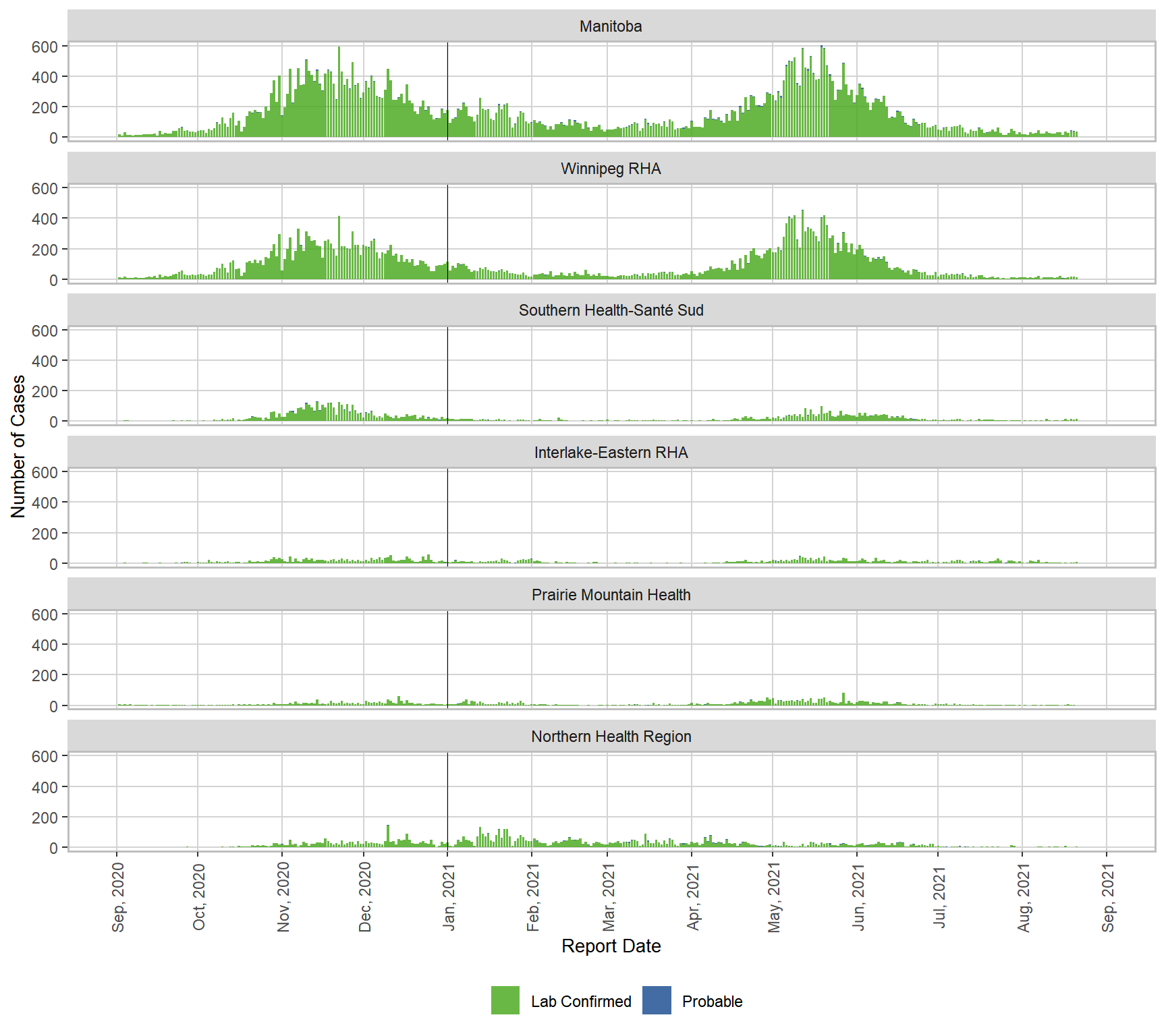 Figure 4. Cases of COVID-19 by Health Region and Public Health Report Date, Manitoba, September 1, 2020 – September 1, 2021