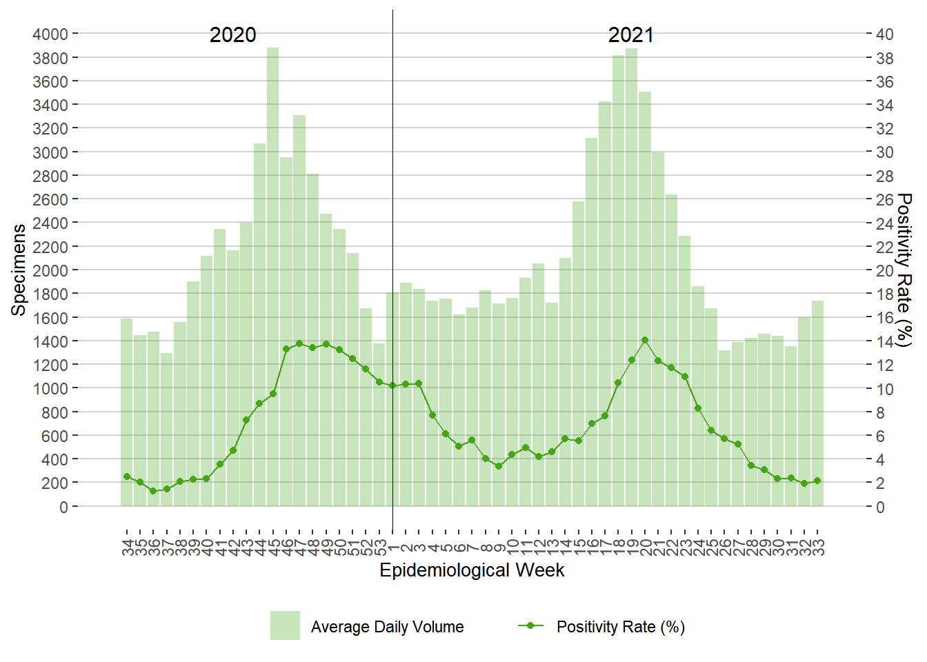 Figure 5. Average Daily Testing Volume and Positivity (%) for COVID-19 by Week of Specimen Receiving Date, Manitoba, August 16, 2020 – August 21, 2021