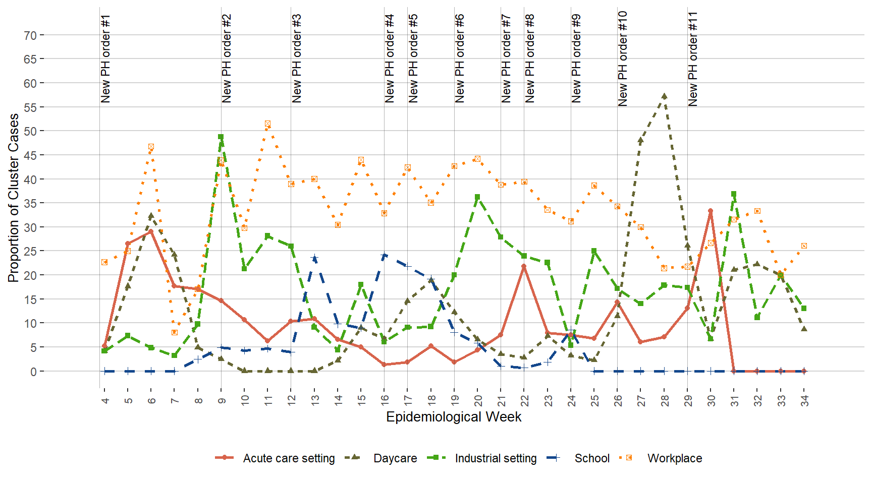 Figure 11. Percentage of COVID-19 Cases Linked to Top-five Cluster/Outbreak/Special Investigation Settings, Manitoba, January 24, 2021 – August 28, 2021