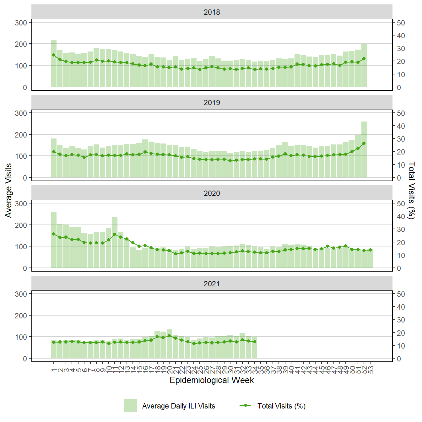 Figure 17. Weekly Respiratory Visits to Emergency Department, Winnipeg Regional Health Authority, Manitoba, 2018 – 2021