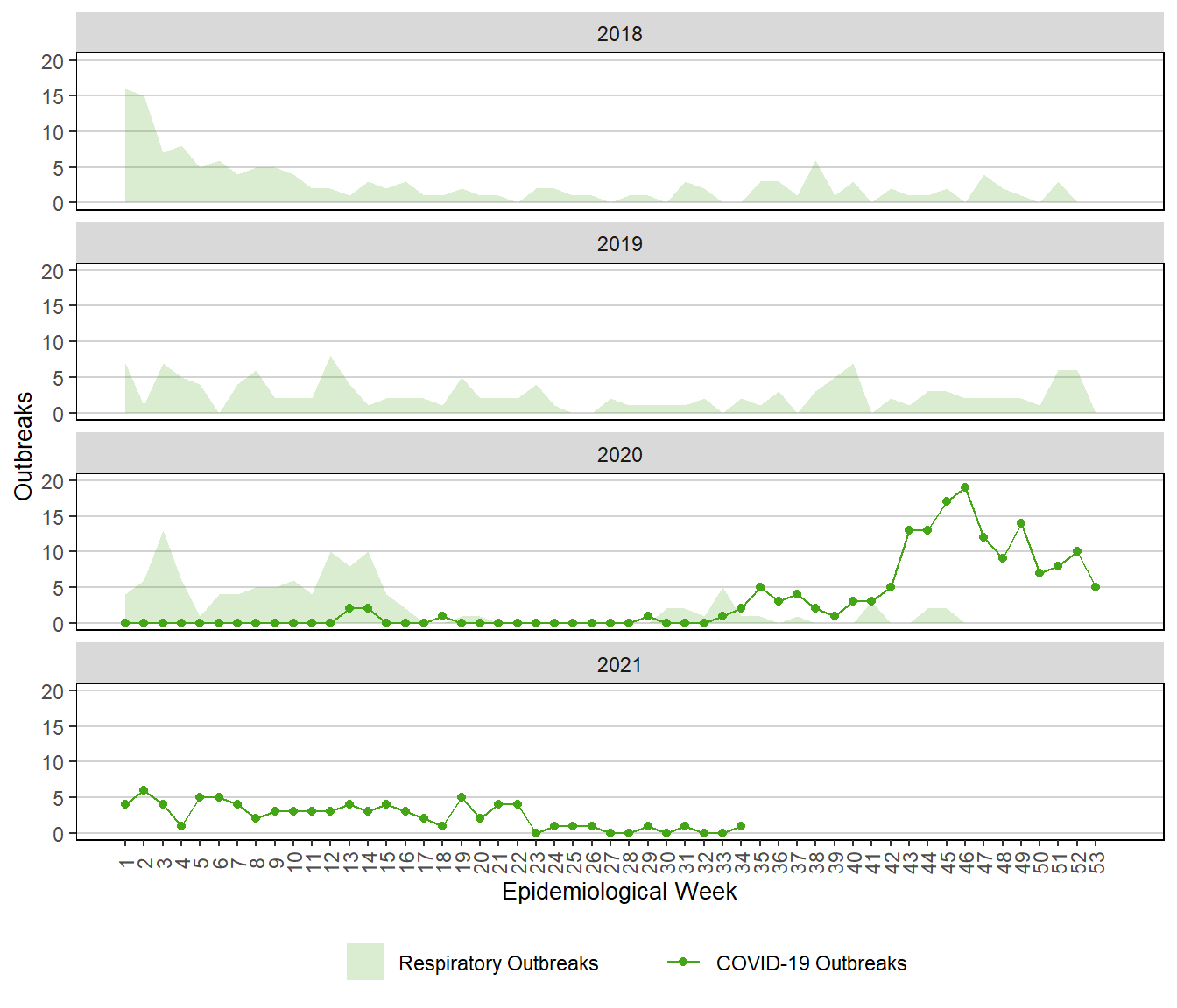 Figure 10. Weekly Respiratory and COVID-19 Outbreaks, Manitoba, 2018 – 2021