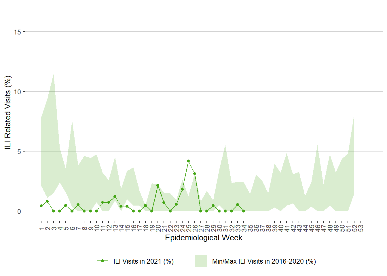 Figure 16. Weekly Percentage of ILI Related Visits to Sentinel Physicians, Manitoba, 2021