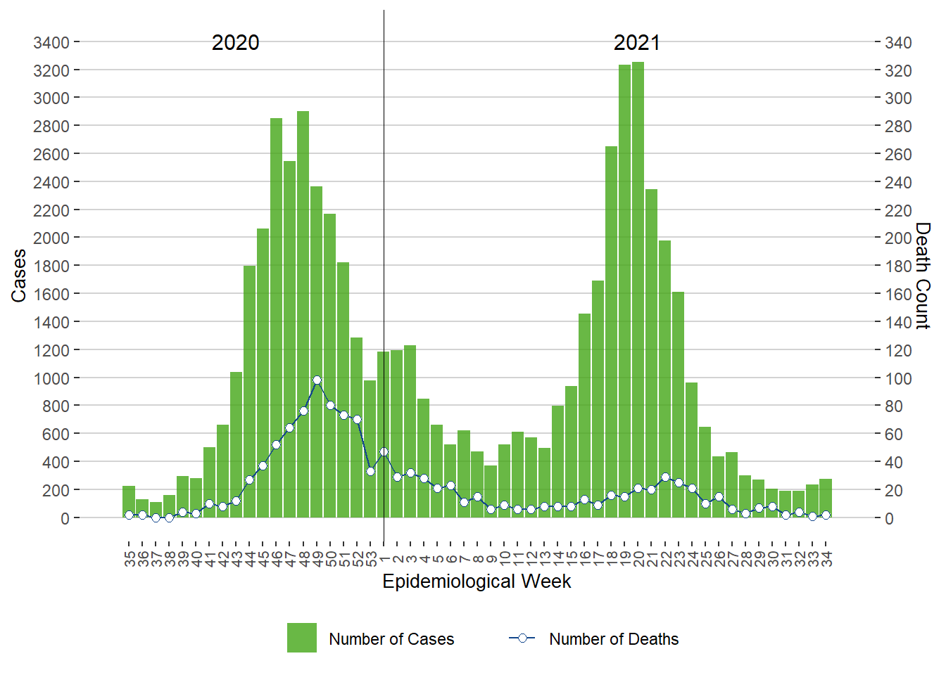 Note. Deaths due to COVID-19 were aligned by week of death date.