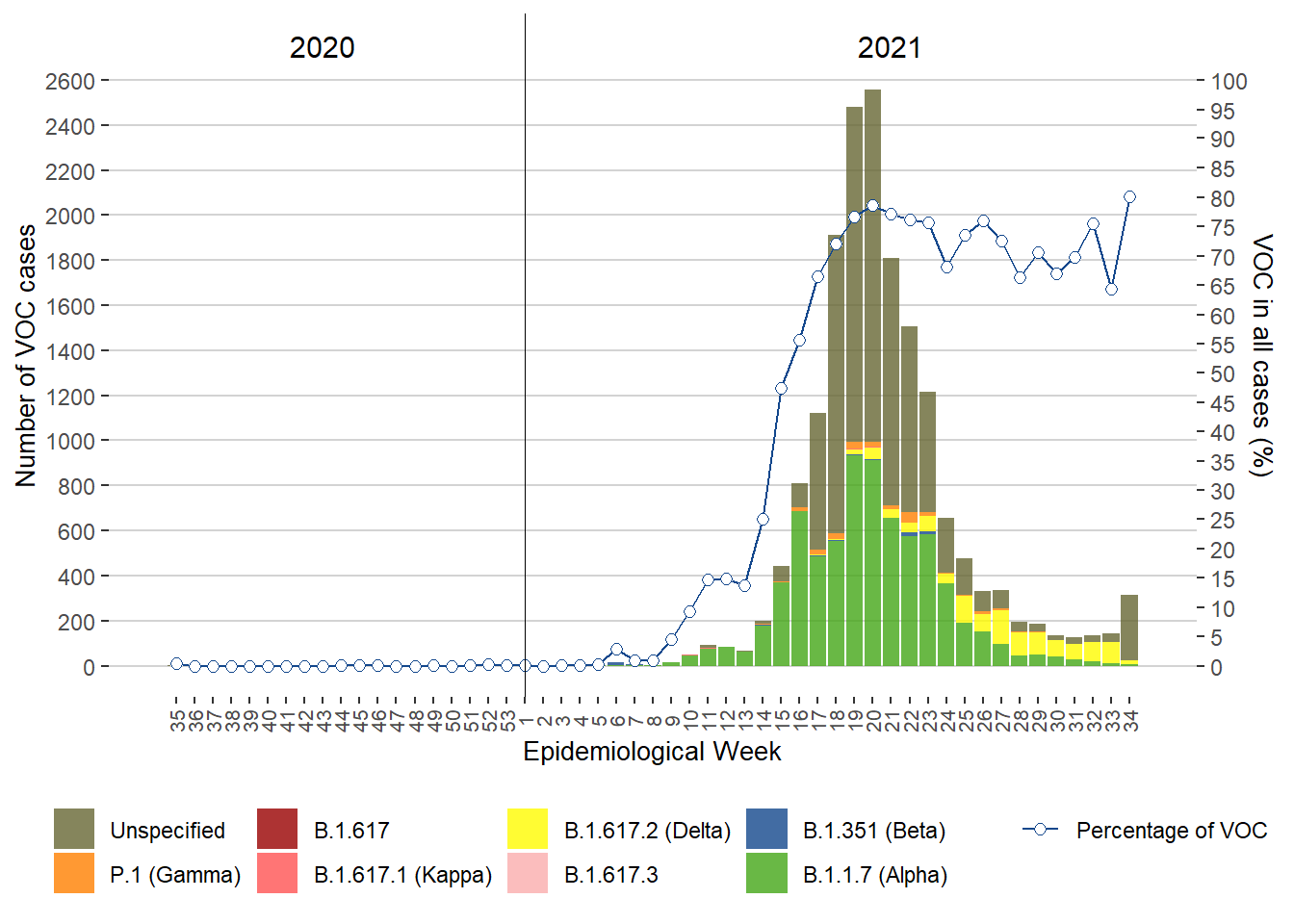 Figure 2. COVID-19 Cases of Variants of Concern (VOC) by Type and Percentage of VOC Cases in All Cases by Week of Public Health Report Date, Manitoba, August 23, 2020 – August 28, 2021