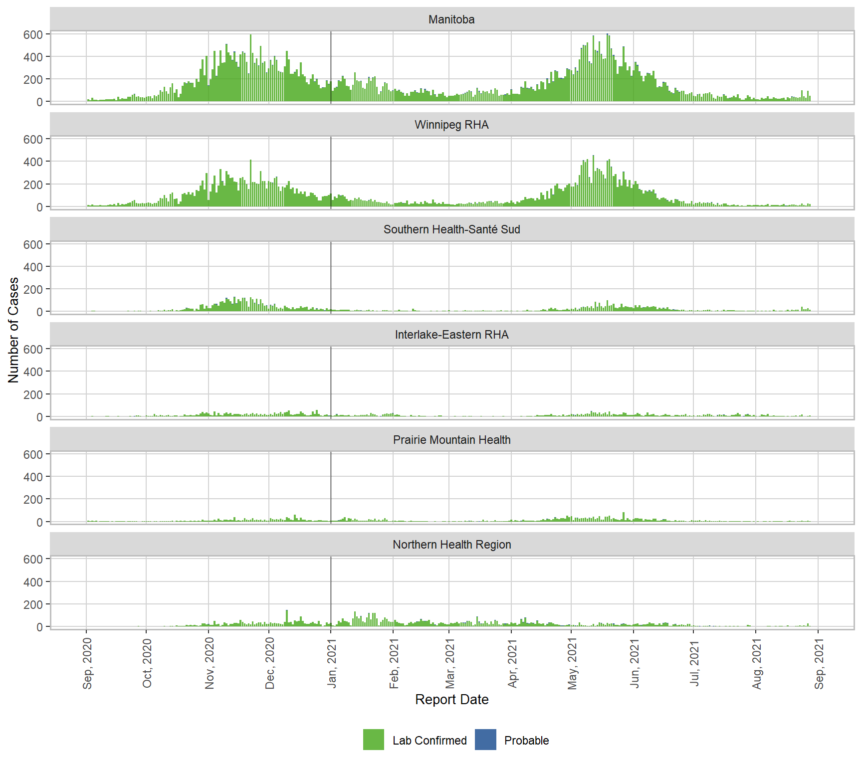 Figure 4. Cases of COVID-19 by Health Region and Public Health Report Date, Manitoba, September 1, 2020 – September 1, 2021