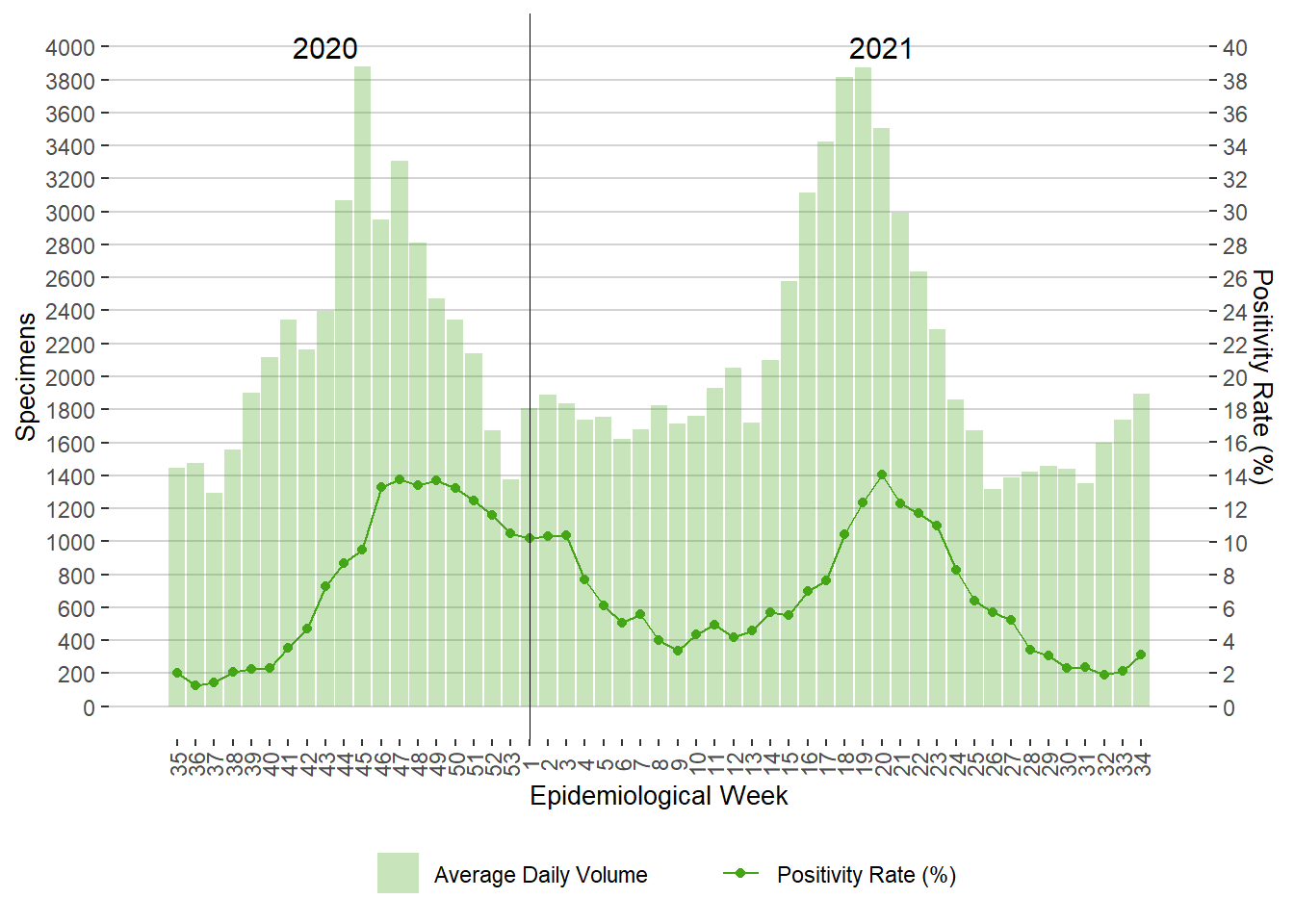 Figure 6. Average Daily Testing Volume and Positivity (%) for COVID-19 by Week of Specimen Receiving Date, Manitoba, August 23, 2020 – August 28, 2021