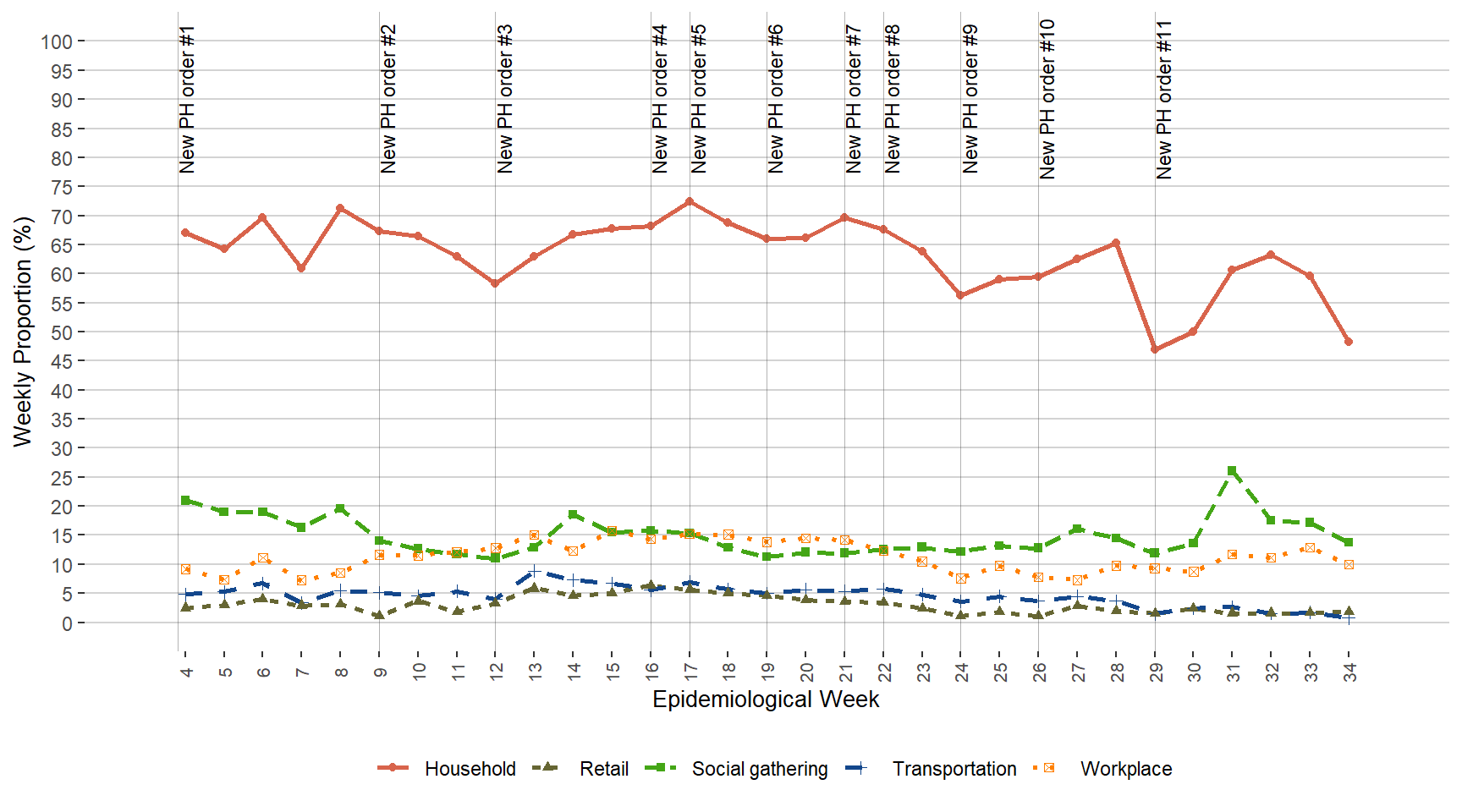 Figure 12. Percentage of Total COVID-19 Cases Exposed to Top-five Transmission Settings, Manitoba, January 24, 2021 – August 28, 2021