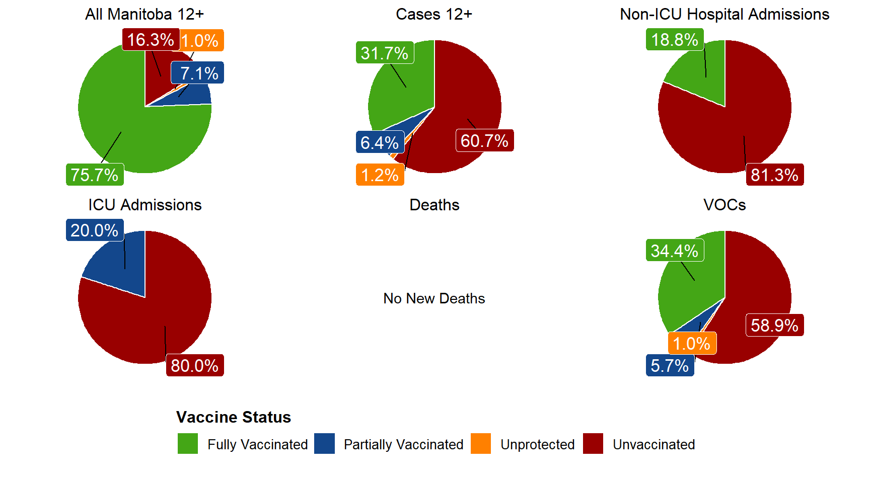 Figure 5. Vaccination Status in New Cases 12+, non-ICU Hospital Admissions, ICU Admissions, Deaths, and VOCs, Manitoba, August 22, 2021 – August 28, 2021