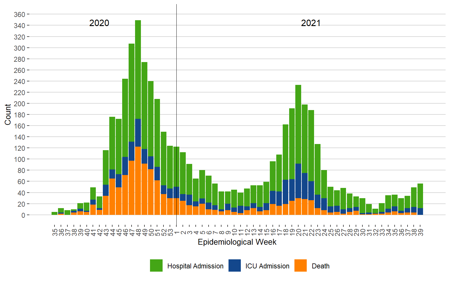 Figure 7. Severe Outcomes of COVID-19 by Week of Public Health Report Date, Manitoba, August 23, 2020 – October 2, 2021