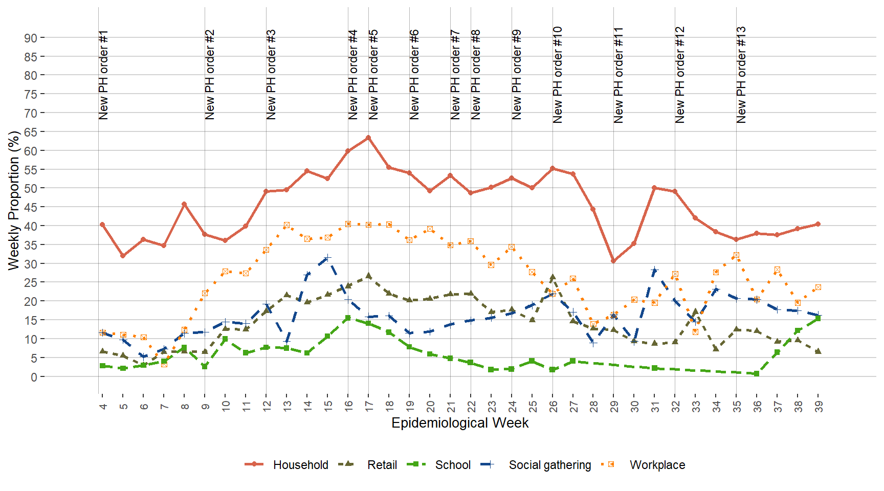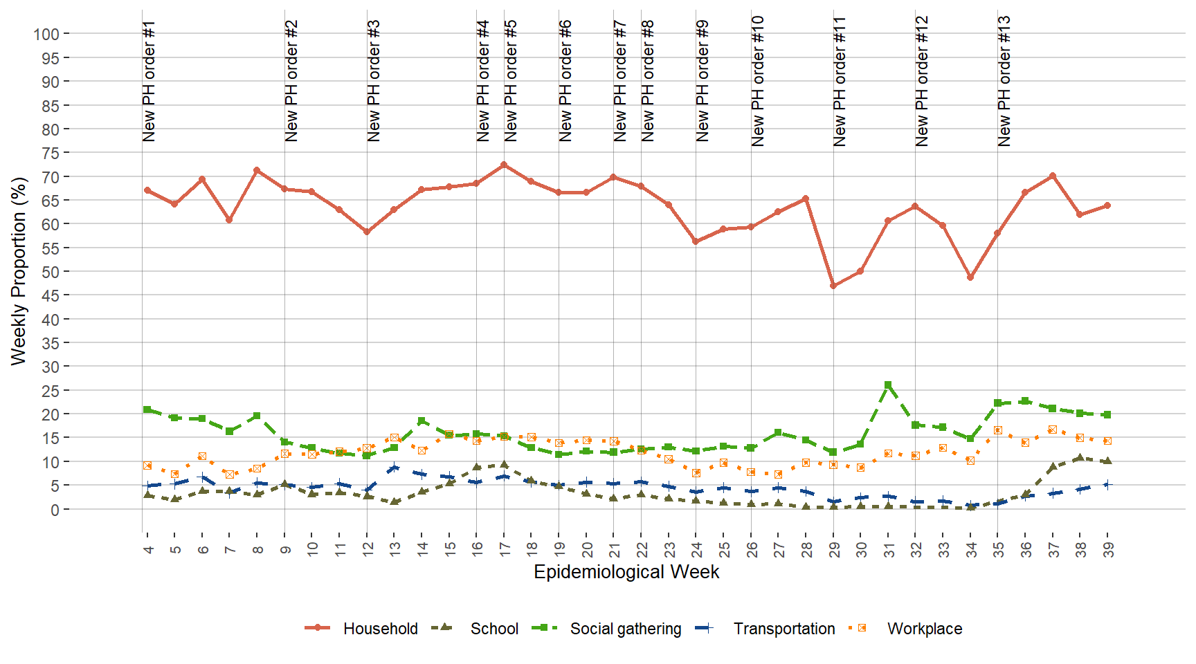 Figure 12. Percentage of Total COVID-19 Cases Exposed to Top-five Transmission Settings, Manitoba, January 24, 2021 – October 2, 2021
