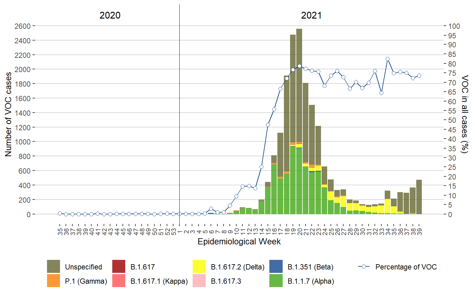Figure 2. COVID-19 Cases of Variants of Concern (VOC) by Type and Percentage of VOC Cases in All Cases by Week of Public Health Report Date, Manitoba, August 23, 2020 – October 2, 2021