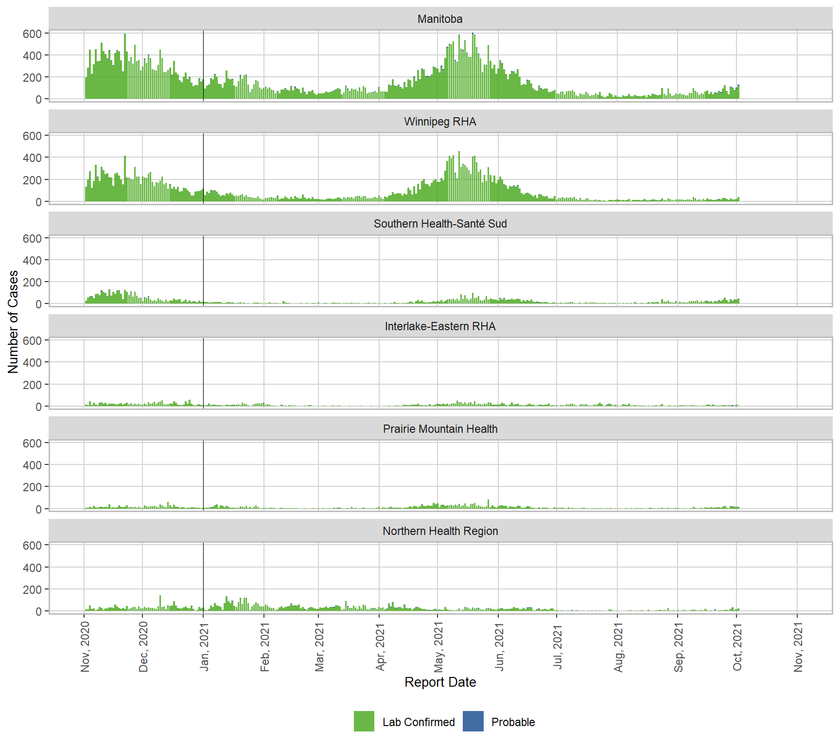 Figure 4. Cases of COVID-19 by Health Region and Public Health Report Date, Manitoba, November 1, 2020 – October 2, 2021