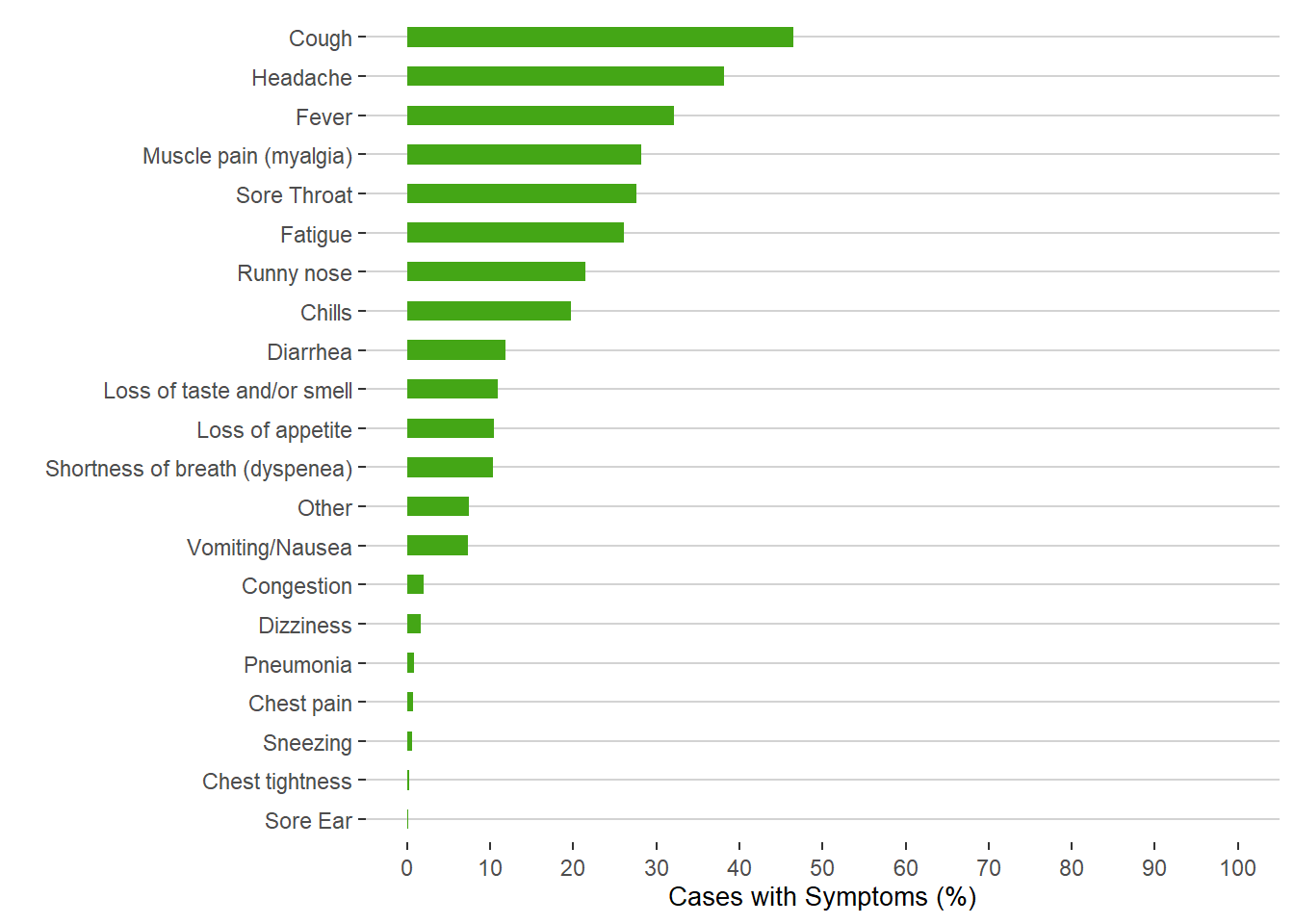 Figure 14. Percentage of Symptoms Reported by COVID-19 Cases, Manitoba, March 13, 2020 – October 2, 2021