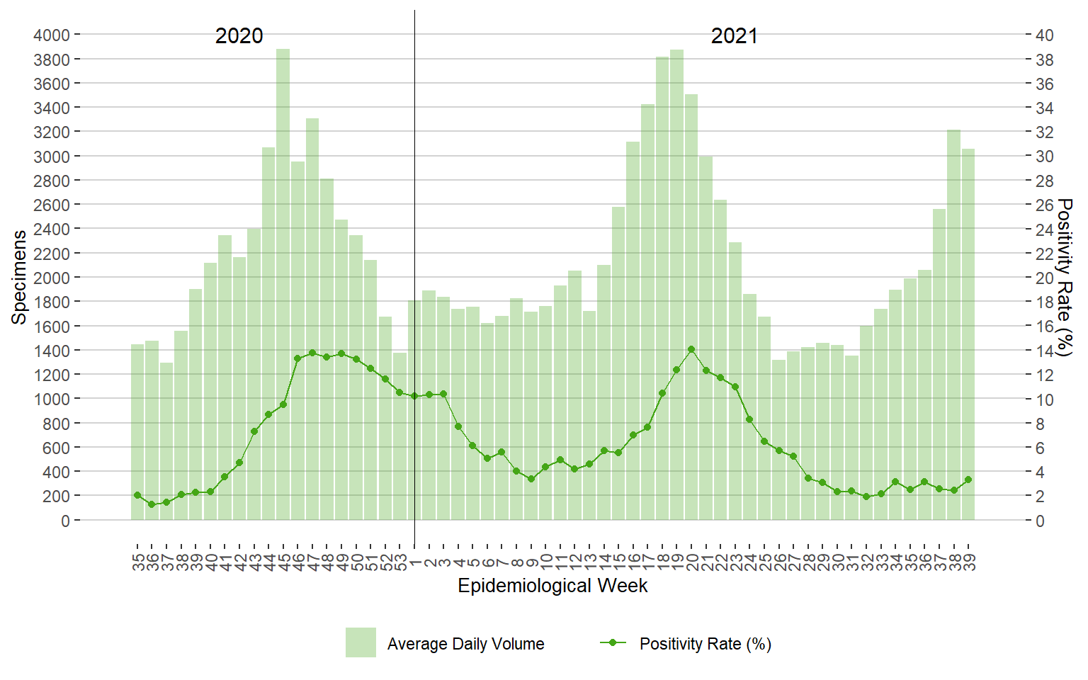 Figure 6. Average Daily Testing Volume and Positivity (%) for COVID-19 by Week of Specimen Receiving Date, Manitoba, August 23, 2020 – October 2, 2021