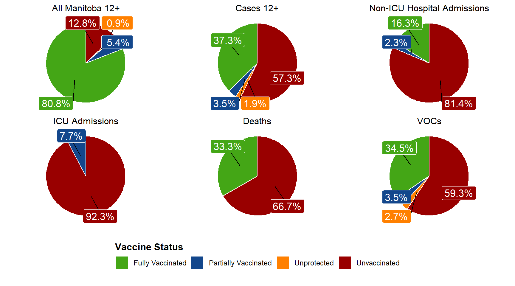 Figure 5. Vaccination Status in New Cases 12+, non-ICU Hospital Admissions, ICU Admissions, Deaths, and VOCs, Manitoba, September 26, 2021 – October 2, 2021