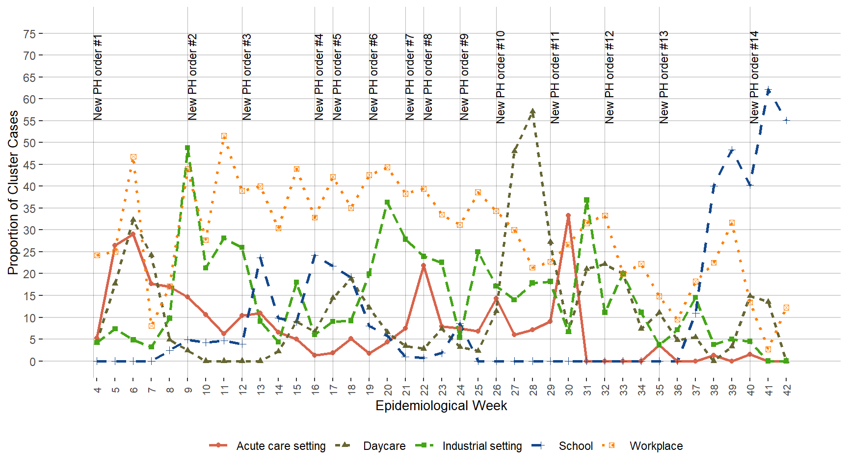 Figure 12. Percentage of COVID-19 Cases Linked to Top-five Cluster/Outbreak/Special Investigation Settings, Manitoba, January 24, 2021 – October 23, 2021