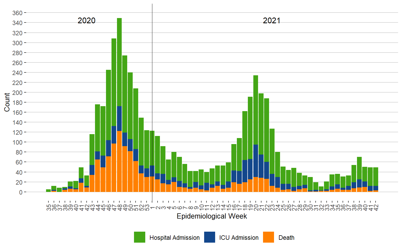 Figure 8. Severe Outcomes of COVID-19 by Week of Public Health Report Date, Manitoba, August 23, 2020 – October 23, 2021