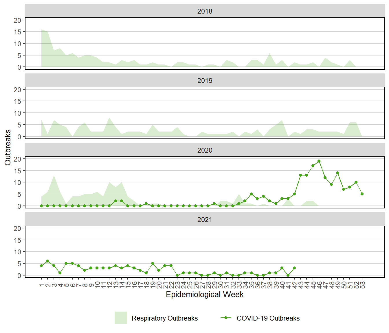 Figure 11. Weekly COVID-19 Outbreaks, Manitoba, 2018 – 2021
