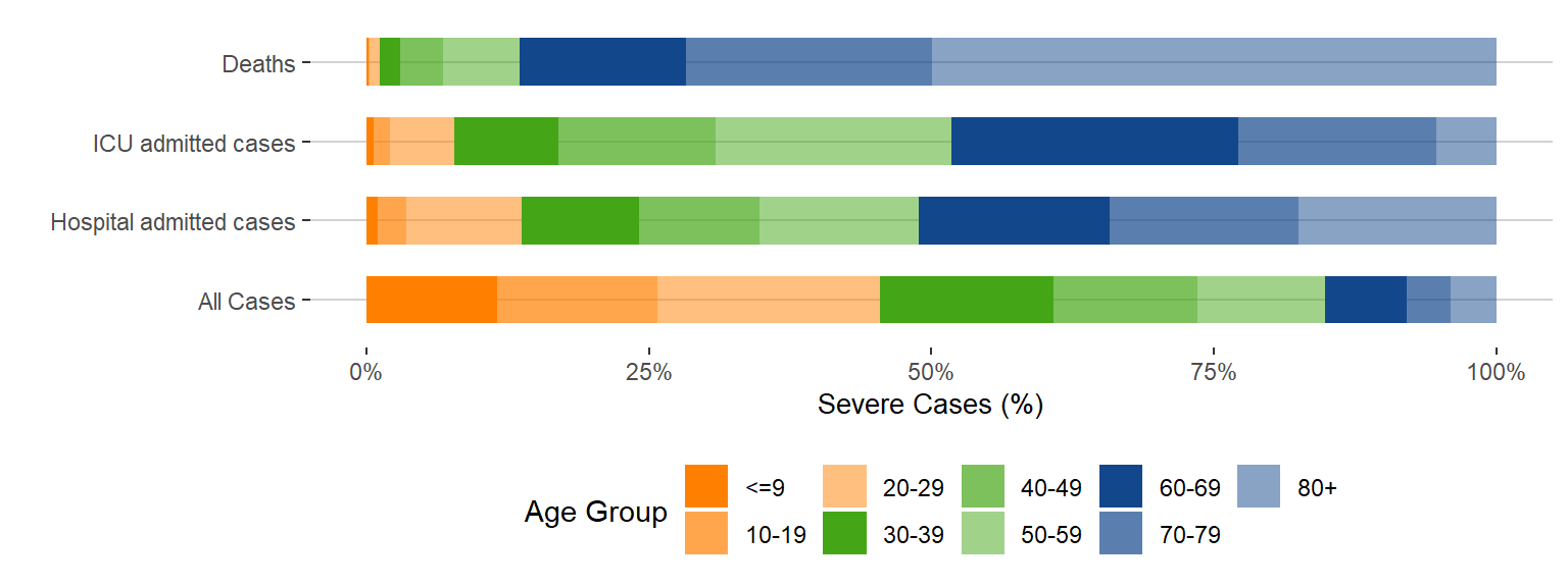 Figure 9. Age Distribution of Severe COVID-19 Cases Compared to All Cases, Manitoba, March 13, 2020 – October 23, 2021