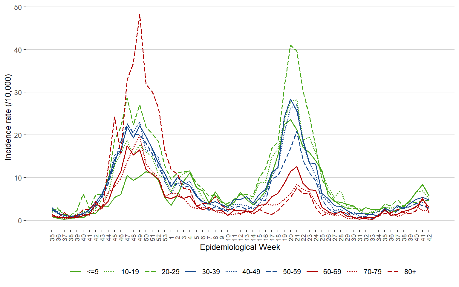 Back Figure 4. Incidence Rate (/10,000 Population) of COVID-19 Cases by Age Group and Week of Public Health Report Date, Manitoba, August 23, 2020 – October 23, 2021