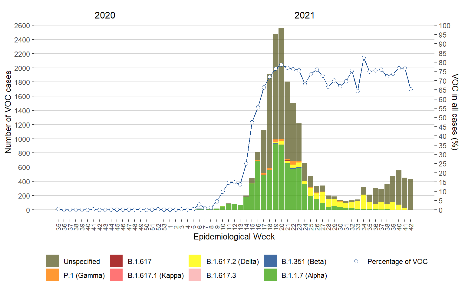 Figure 2. COVID-19 Cases of Variants of Concern (VOC) by Type and Percentage of VOC Cases in All Cases by Week of Public Health Report Date, Manitoba, August 23, 2020 – October 23, 2021