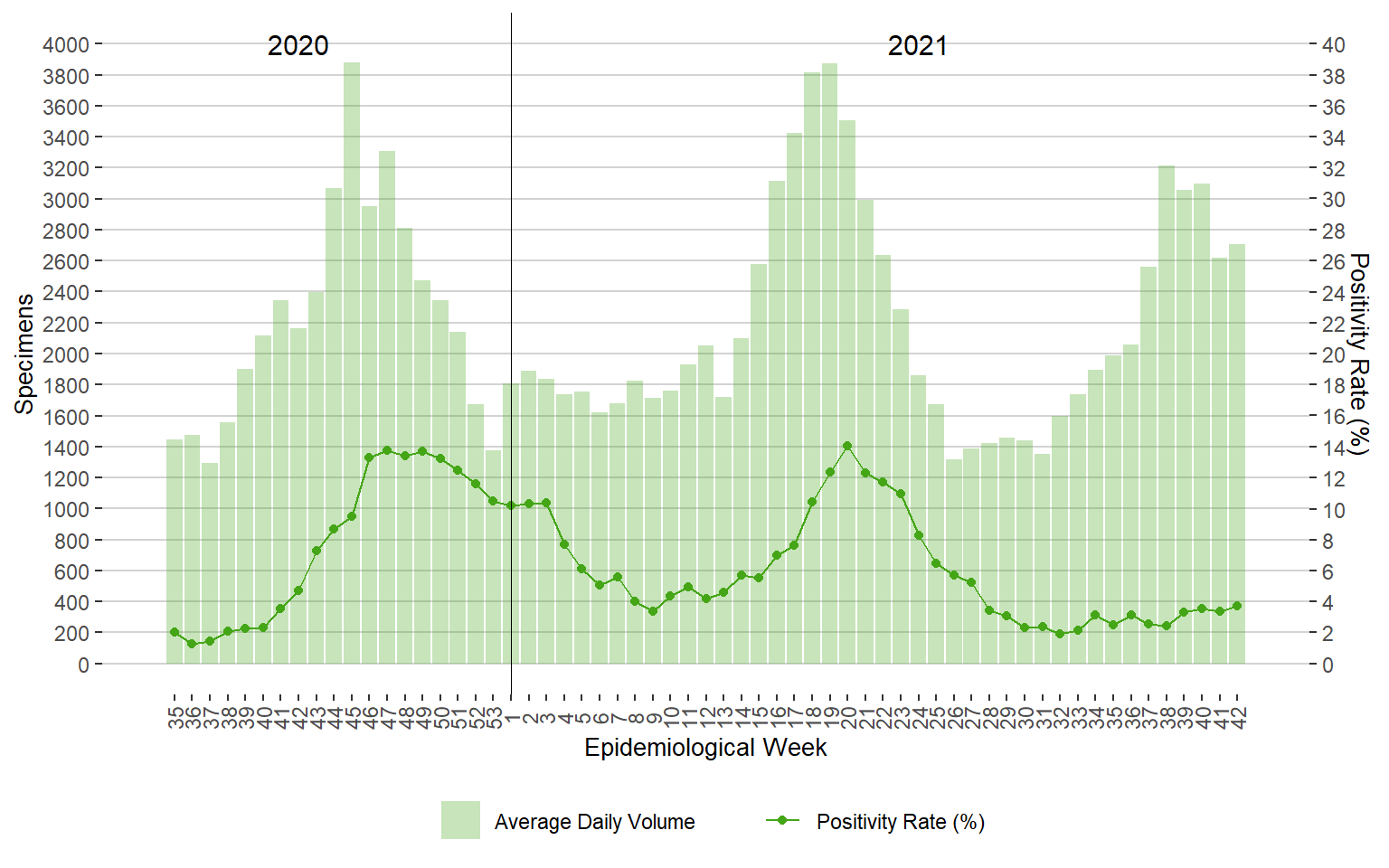 Figure 7. Average Daily Testing Volume and Positivity (%) for COVID-19 by Week of Specimen Receiving Date, Manitoba, August 23, 2020 – October 23, 2021