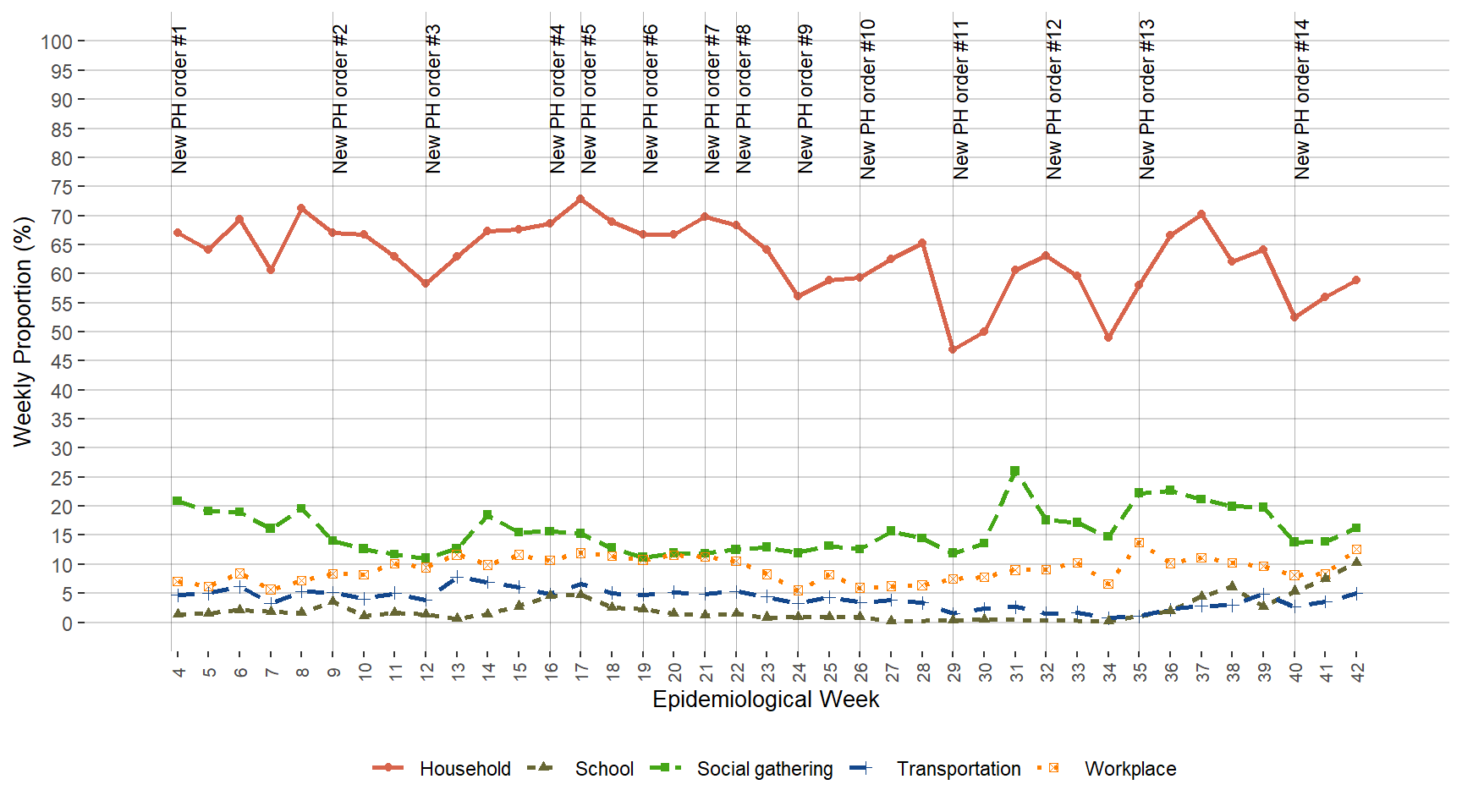Figure 14. Percentage of Community-transmitted COVID-19 Cases Exposed to Top-five Acquisition Settings, Manitoba, January 24, 2021 – October 23, 2021