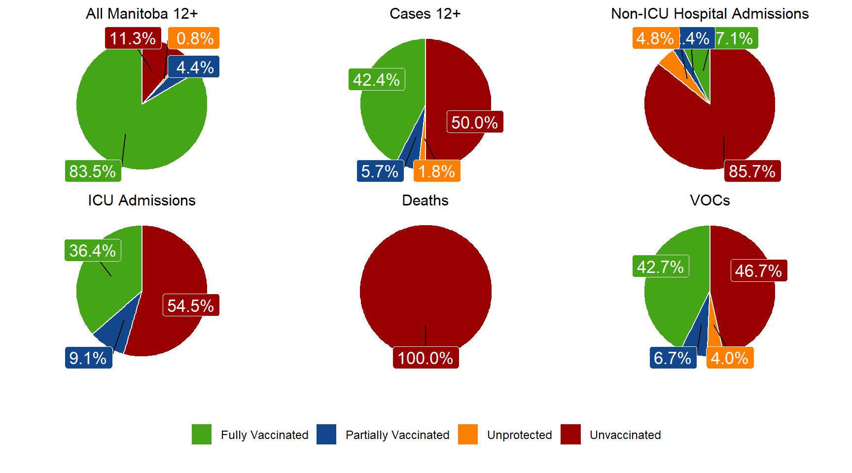 BackFigure 6. Vaccination Status in New Cases 12+, non-ICU Hospital Admissions, ICU Admissions, Deaths, and VOCs, Manitoba, October 17, 2021 – October 23, 2021