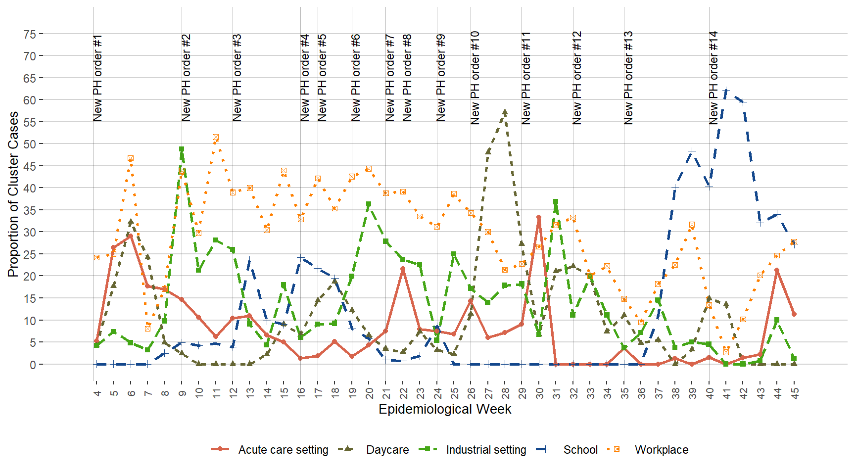 Figure 12. Percentage of COVID-19 Cases Linked to Top-five Cluster/Outbreak/Special Investigation Settings, Manitoba, January 24, 2021 – November 13, 2021