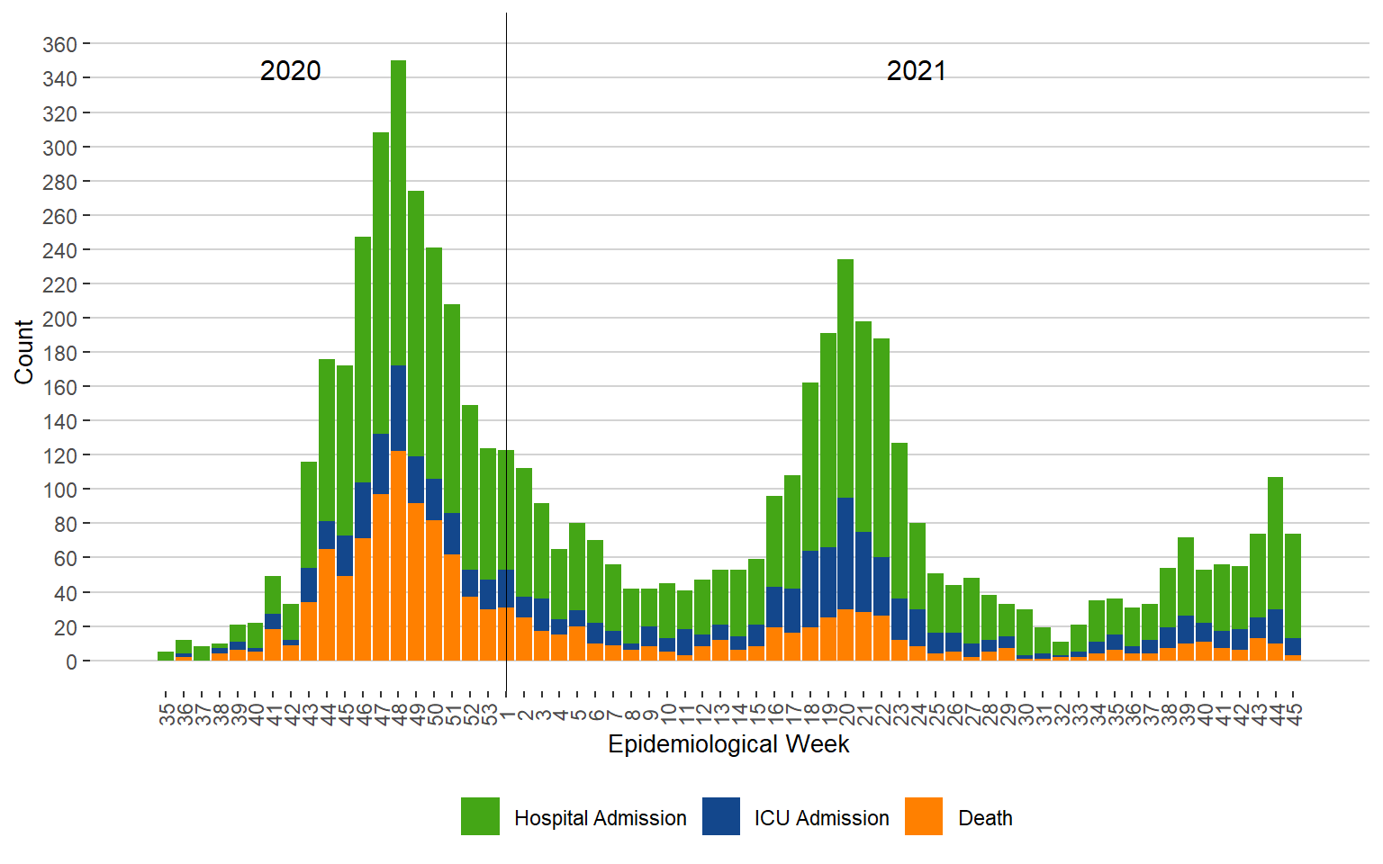 Figure 8. Severe Outcomes of COVID-19 by Week of Public Health Report Date, Manitoba, August 23, 2020 – November 13, 2021