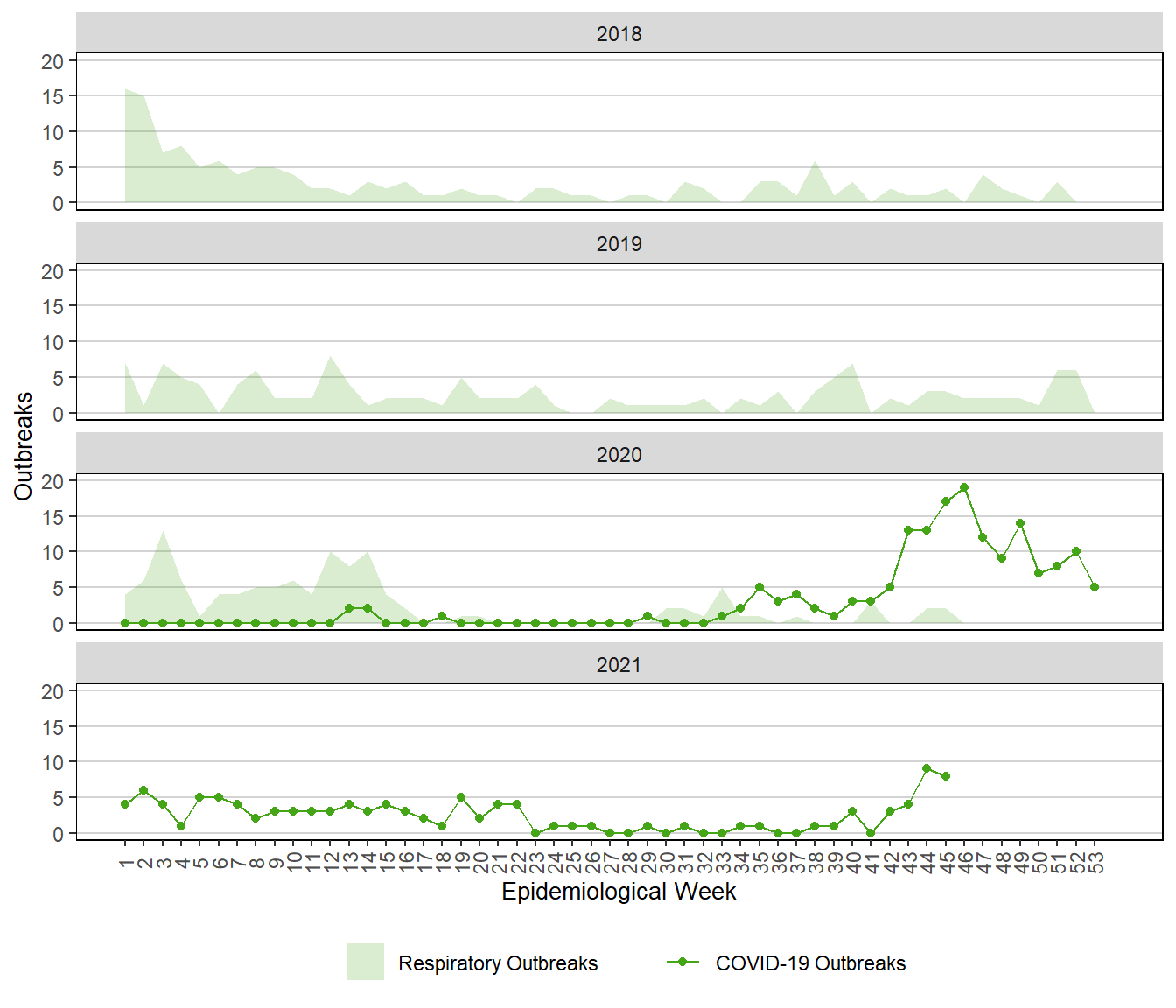 Figure 11. Weekly COVID-19 Outbreaks, Manitoba, 2018 – 2021