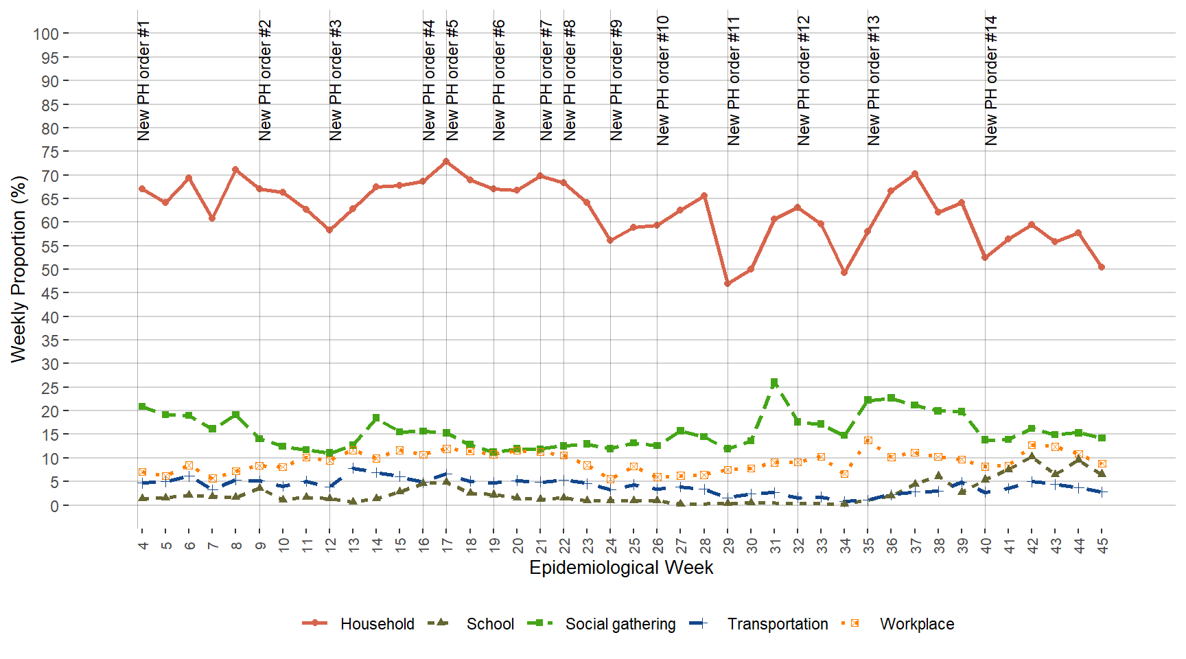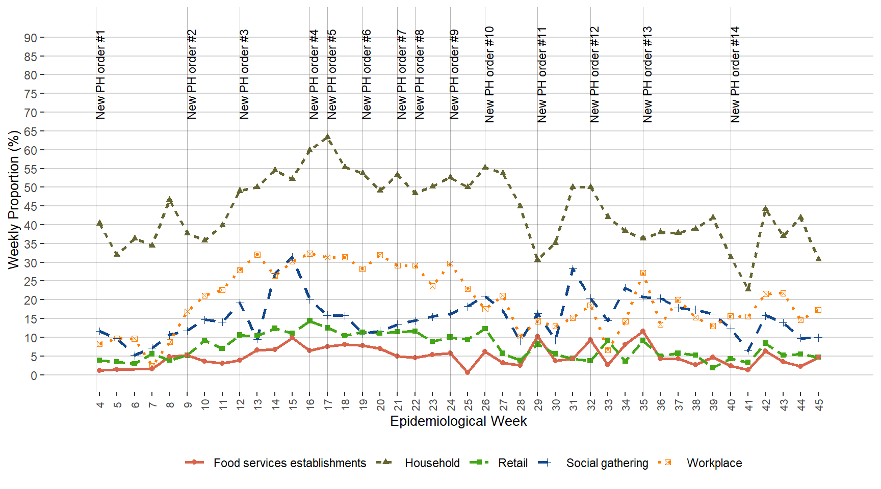 Figure 14. Percentage of Community-transmitted COVID-19 Cases Exposed to Top-five Acquisition Settings, Manitoba, January 24, 2021 – November 13, 2021