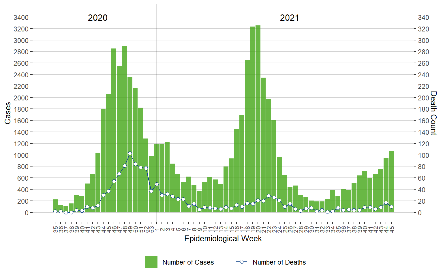 Figure 1. Cases of COVID-19 by Week of Public Health Report Date, Manitoba, August 23, 2020 – November 13, 2021