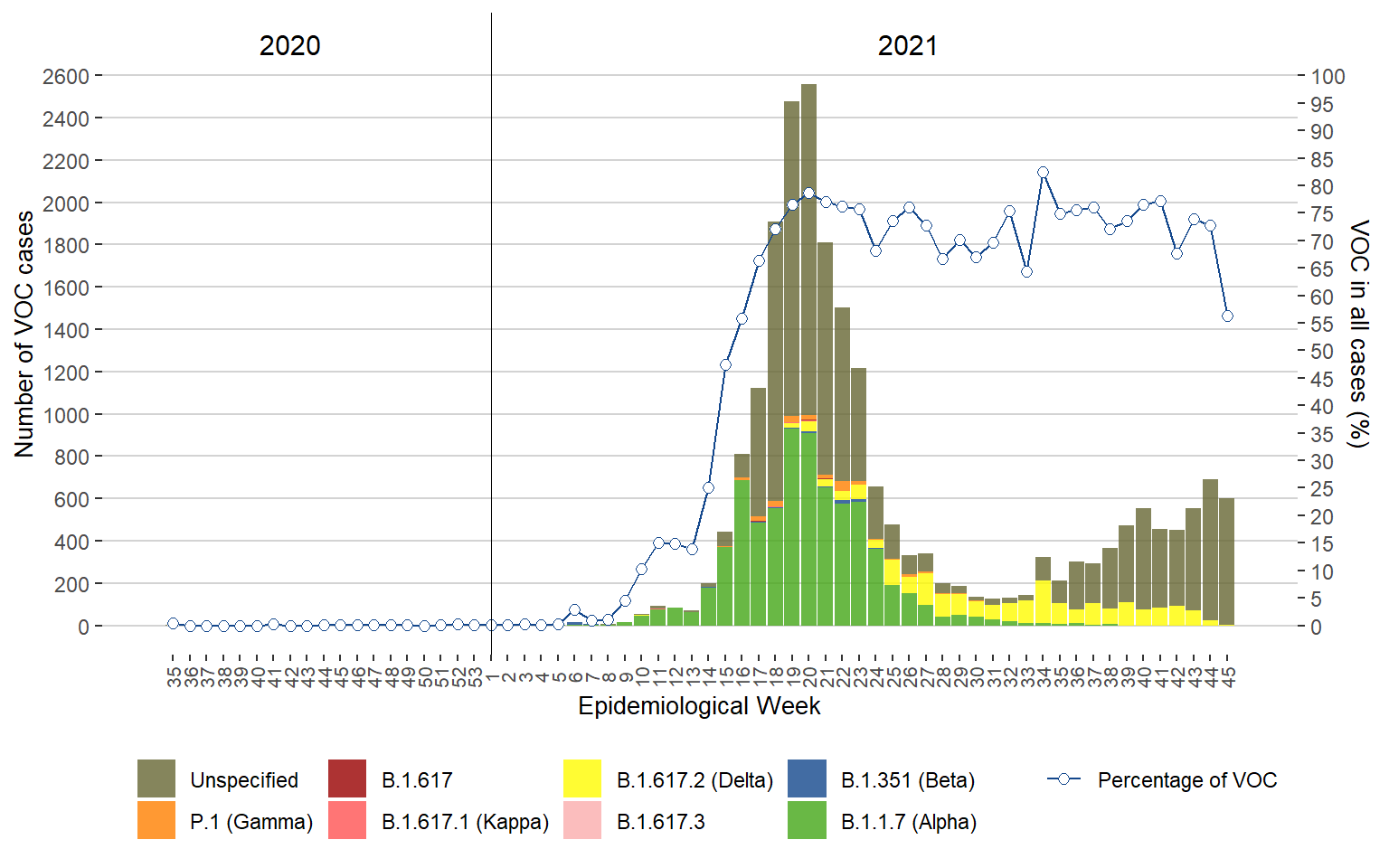 Figure 2. COVID-19 Cases of Variants of Concern (VOC) by Type and Percentage of VOC Cases in All Cases by Week of Public Health Report Date, Manitoba, August 23, 2020 – November 13, 2021