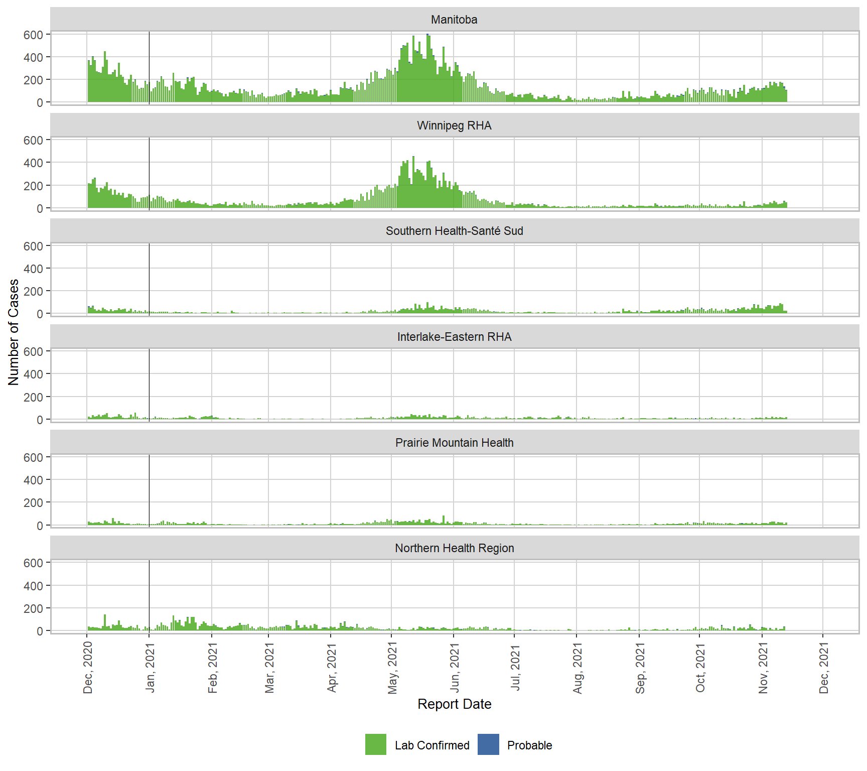 Back Figure 5. Cases of COVID-19 by Health Region and Public Health Report Date, Manitoba, December 1, 2020 – November 13, 2021
