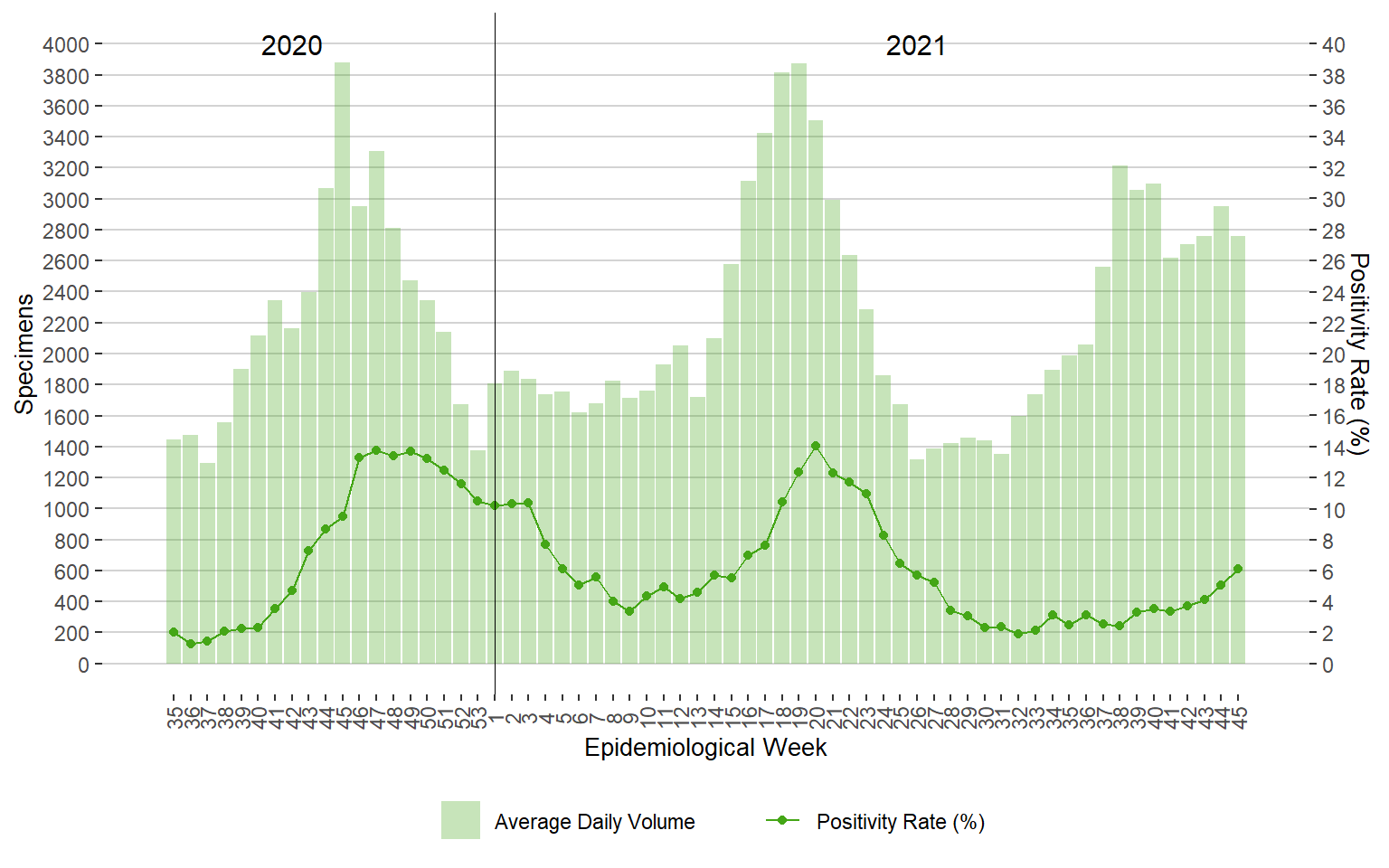Figure 7. Average Daily Testing Volume and Positivity (%) for COVID-19 by Week of Specimen Receiving Date, Manitoba, August 23, 2020 – November 13, 2021