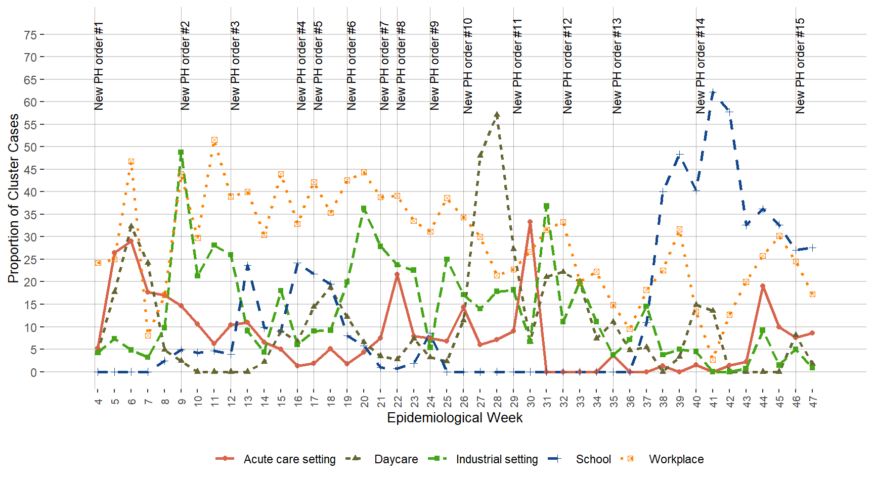 Figure 11. Percentage of COVID-19 Cases Linked to Top-five Cluster/Outbreak/Special Investigation Settings, Manitoba, January 24, 2021 – November 27, 2021