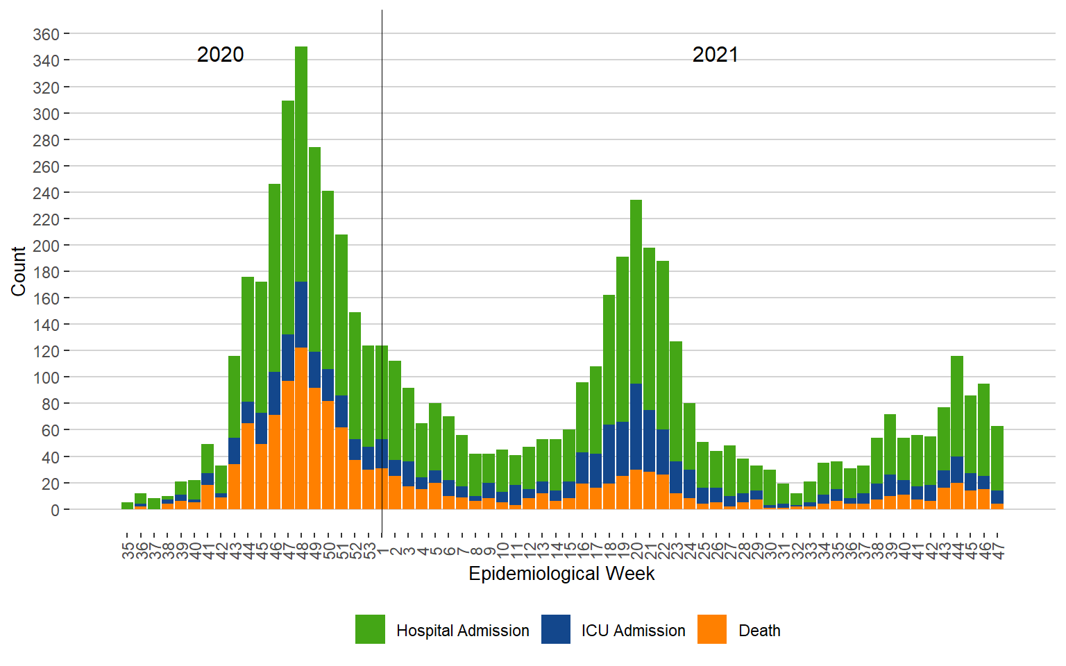 Figure 7. Severe Outcomes of COVID-19 by Week of Public Health Report Date, Manitoba, August 23, 2020 – November 27, 2021