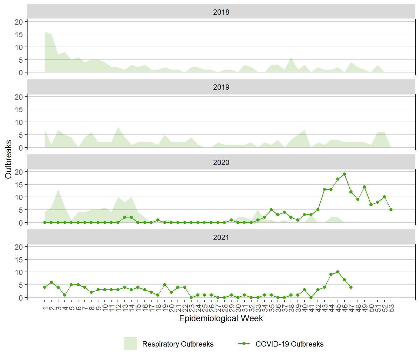 Figure 10. Weekly COVID-19 Outbreaks, Manitoba, 2018 – 2021