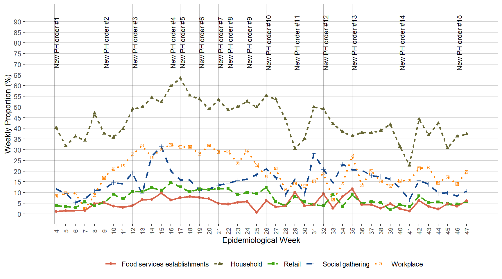 Figure 13. Percentage of Community-transmitted COVID-19 Cases Exposed to Top-five Acquisition Settings, Manitoba, January 24, 2021 – November 27, 2021
