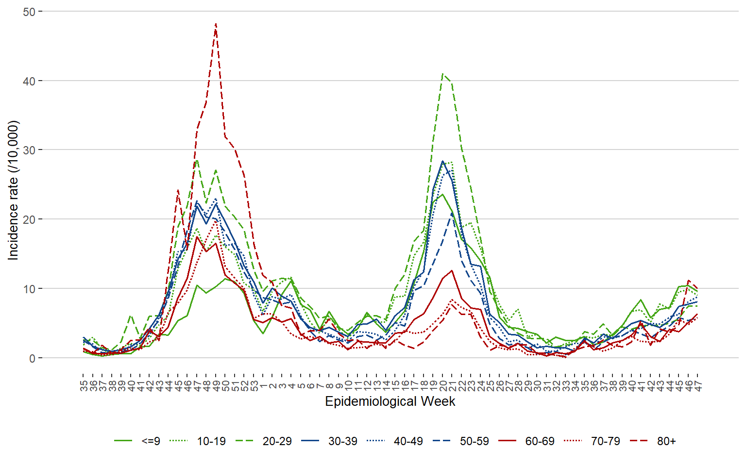 Back Figure 3. Incidence Rate (/10,000 Population) of COVID-19 Cases by Age Group and Week of Public Health Report Date, Manitoba, August 23, 2020 – November 27, 2021
