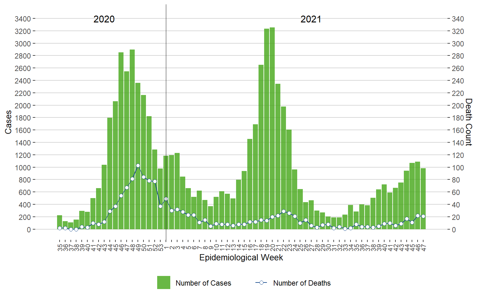 Figure 1. Cases of COVID-19 by Week of Public Health Report Date, Manitoba, August 23, 2020 – November 27, 2021