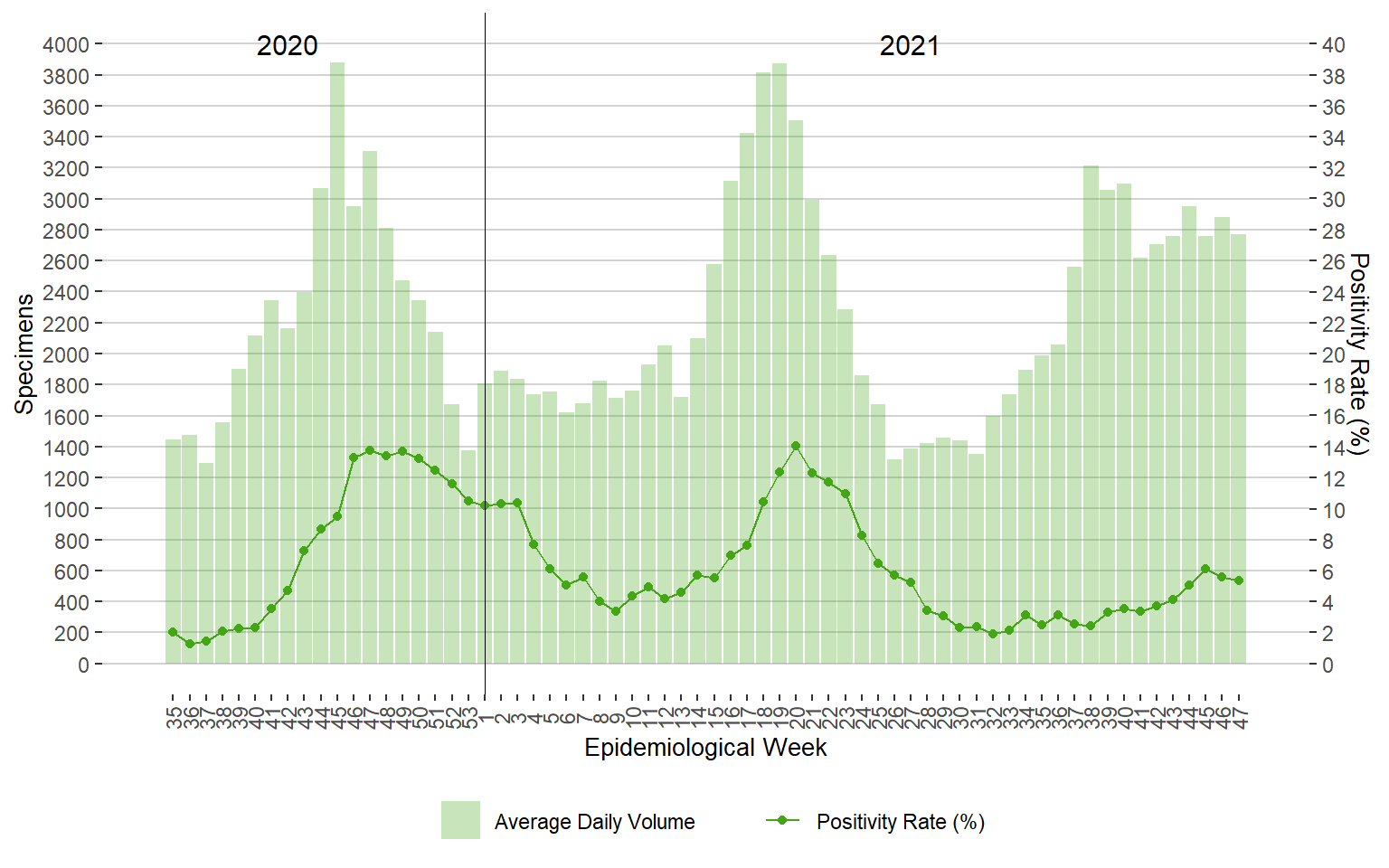 Figure 6. Average Daily Testing Volume and Positivity (%) for COVID-19 by Week of Specimen Receiving Date, Manitoba, August 23, 2020 – November 27, 2021